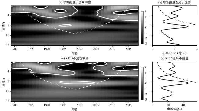 图9 西藏波密卡达沟流域年降雨量和R12.5的小波功率谱和全局小波谱 色条表示小波功率谱强度, 颜色越浅, 能量越强Fig.9 Wavelet power spectrum and global wavelet spectrum of annual rainfall and R12.5 in Kada valley, Bomi County, Tibet.The color bars represent the intensity of the wavelet power spectrum, where lighter colors indicate higher energy |