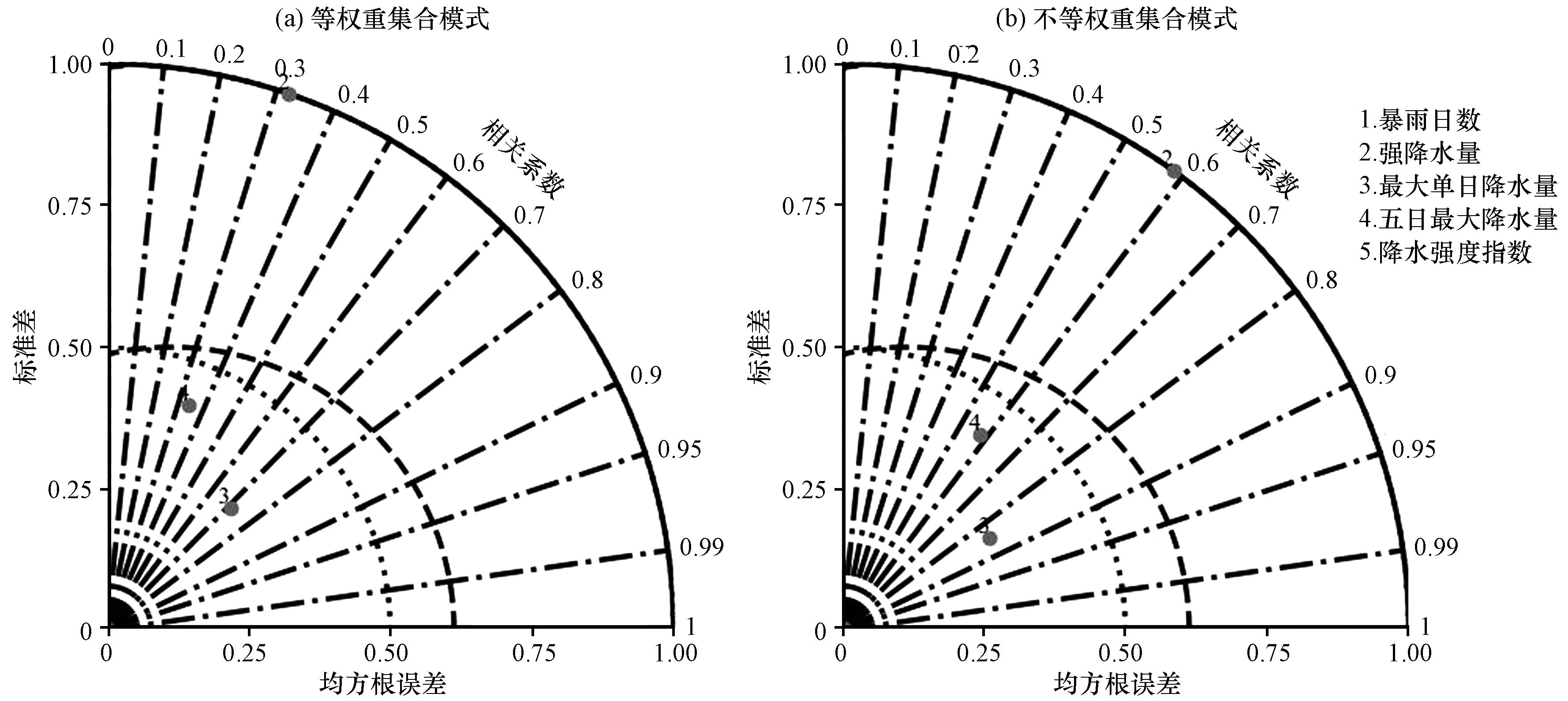 表3 5个CMIP6单模式与5个极端降水指数的泰勒图评估结果Table 3 Taylor diagram evaluation results of 5 CMIP6 single models and 5 extreme precipitation indices |