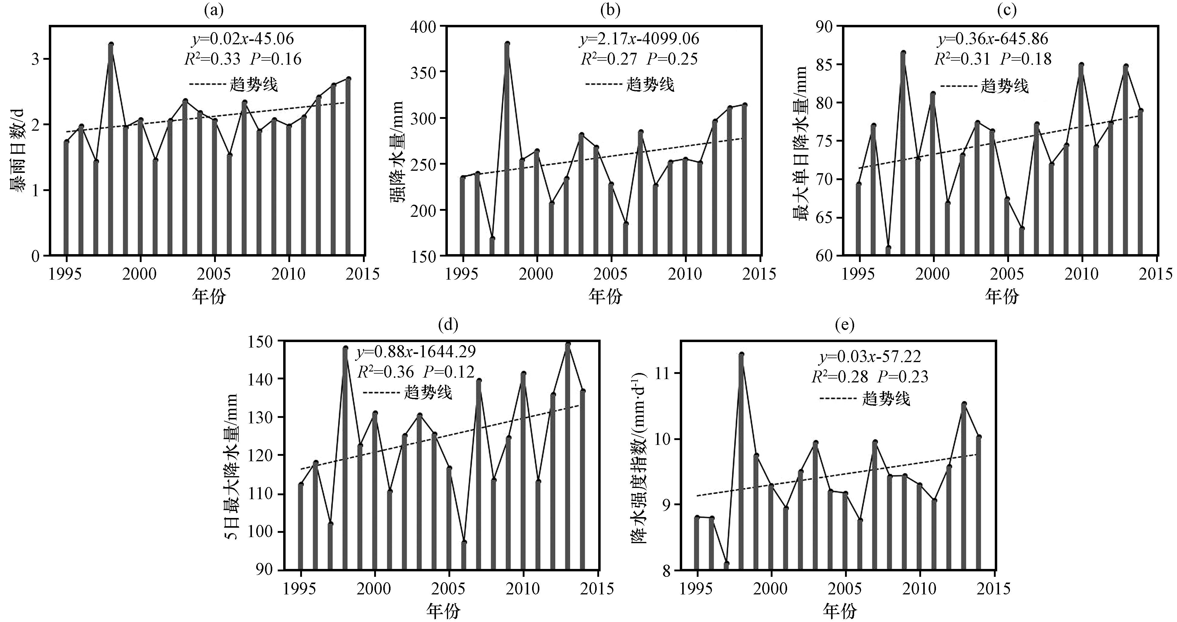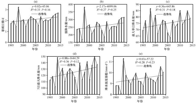 图4 1995-2014年川渝地区暴雨日数(a)、 强降水量(b)、 最大单日降水量(c)、 5日最大降水量(d)和降水强度指数(e)的时间序列Fig.4 The time series plots of the number of rainy days (a), heavy precipitation (b), maximum daily precipitation (c), five-day maximum precipitation (d), and precipitation intensity index (e) in the Sichuan-Chongqing region from 1995 to 2014 |