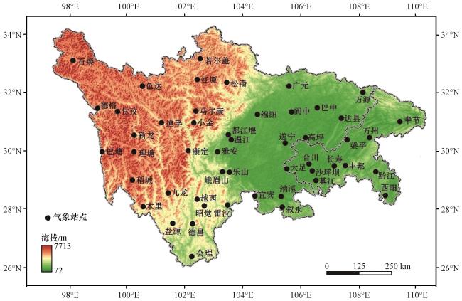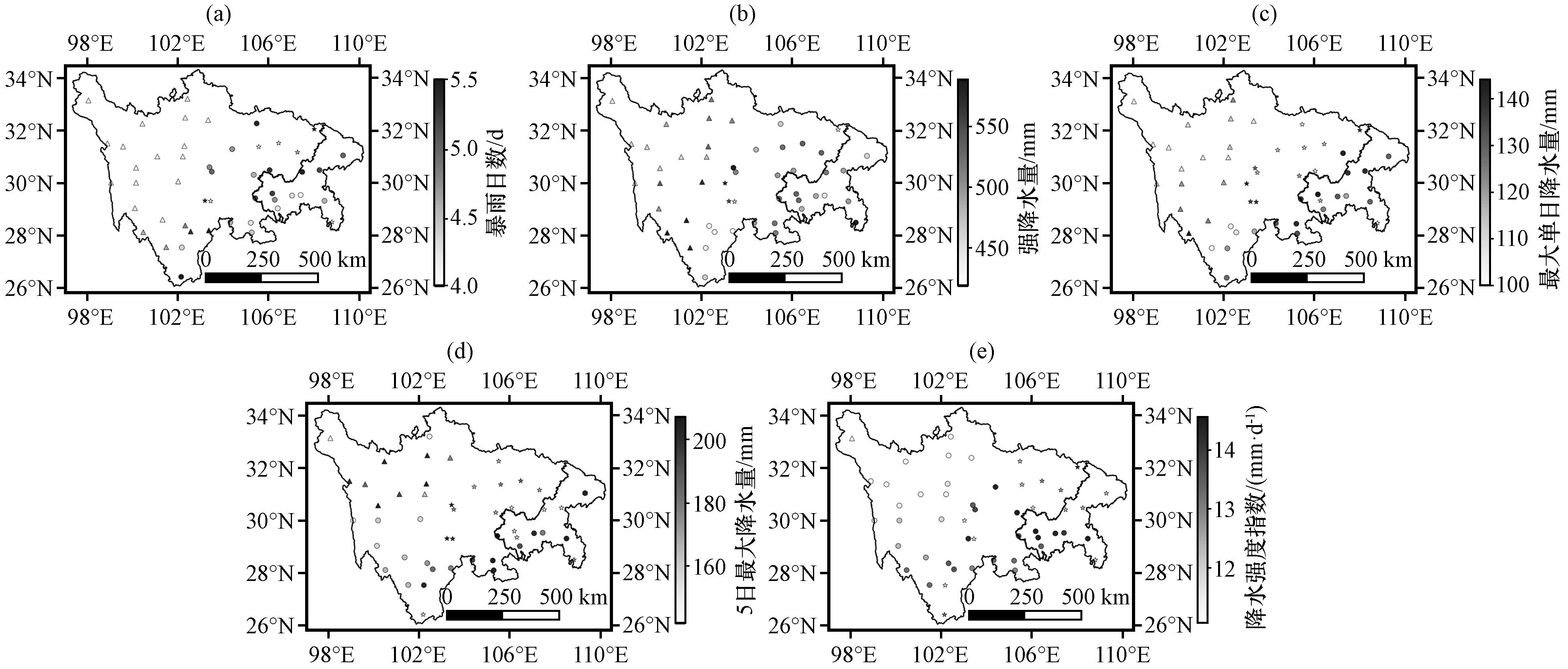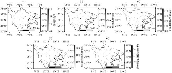 图5 1995 -2014年川渝地区暴雨日数(a, 单位: d)、 强降水量(b, 单位: mm)、 最大单日降水量(c, 单位: mm)、 5日最大降水量(d, 单位: mm)和降水强度指数(e, 单位: mm·d-1)的空间分布Fig.5 Spatial distribution maps of the number of rainy days (a, unit: d), heavy precipitation (b, unit: mm), maximum daily precipitation (c, unit: mm), five-day maximum precipitation (d, unit: mm), and precipitation intensity index (e, unit: mm·d⁻¹) in the Sichuan-Chongqing region from 1995 to 2014 |