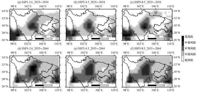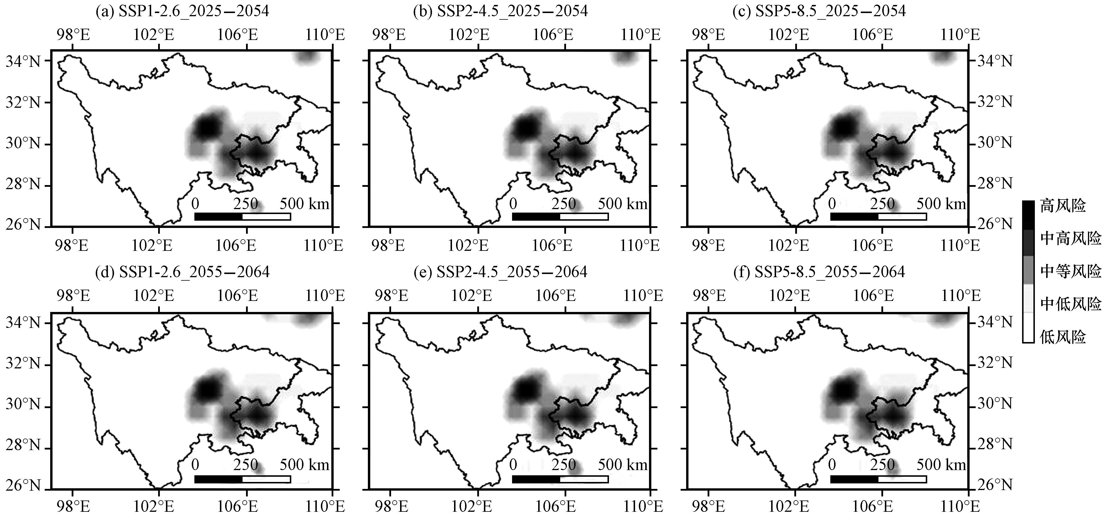 图8 川渝地区未来两个时期三种不同气候变化情景下暴雨洪涝致灾危险性空间分布(a) SSP1-2.6_2025-2054, (b) SSP2-4.5_2025-2054, (c) SSP5-8.5_2025-2054, (d) SSP1-2.6_2055-2064, (e)SSP2-4.5_2055-2064, (f)SSP5-8.5_2055-2064 Fig.8 The spatial distribution map of disaster risk caused by rainstorm and flood under three different climate change scenarios for the future two periods in the Sichuan-Chongqing region.(a) SSP1-2.6_2025-2054, (b) SSP2-4.5_2025-2054, (c) SSP5-8.5_2025-2054, (d) SSP1-2.6_2055-2064, (e) SSP2-4.5_2055-2064, (f) SSP5-8.5_2055-2064 |