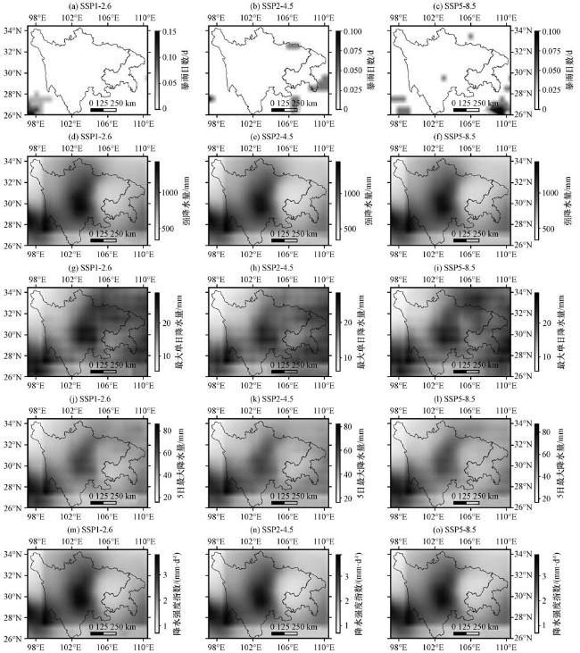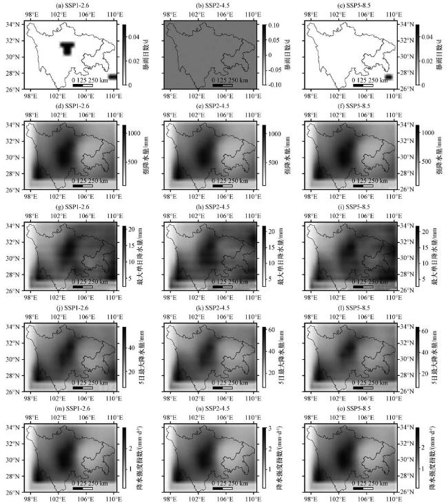图6 未来近期川渝地区暴雨日数(a~c, 单位: d)、 强降水量(d~f, 单位: mm)、 最大单日降水量(g~i, 单位: mm)、 五日最大降水量(j~l, 单位: mm)和降水强度指数(m~o, 单位: mm·d-1)在三种不同气候变化情景下(SSP1-2.6, SSP2-4.5和SSP5-8.5)的空间分布Fig.6 The spatial distribution maps of the future near-term number of rainy days (a~c, unit: d), heavy precipitation (d~f, unit: mm), maximum daily precipitation (g~i, unit: mm), five-day maximum precipitation (j~l, unit: mm), and precipitation intensity index (m~o, unit: mm·d⁻¹) under three different climate change scenarios (SSP1-2.6, SSP2-4.5, and SSP5-8.5) in the Sichuan-Chongqing region |