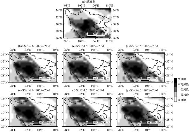 图10 川渝地区基准期(a)及未来两个时期三种不同气候变化情景下(b~g)暴雨洪涝灾害综合风险区划(a)基准期, (b)SSP1-2.6_2025-2054, (c)SSP2-4.5_2025-2054, (d)SSP5-8.5_2025-2054, (e)SSP1-2.6_2055-2064, (f)SSP2-4.5_2055-2064, (g)SSP5-8.5_2055-2064 Fig.10 The comprehensive risk zoning map of rainstorm and flood disasters under the baseline period (a) and three different climate change scenarios for the future two periods (b~g) in the Sichuan-Chongqing region.(a) baseline period, (b) SSP1-2.6_2025-2054, (c) SSP2-4.5_2025-2054, (d) SSP5-8.5_2025-2054, (e) SSP1-2.6_2055-2064, (f) SSP2-4.5_2055-2064, (g) SSP5-8.5_2055-2064 |