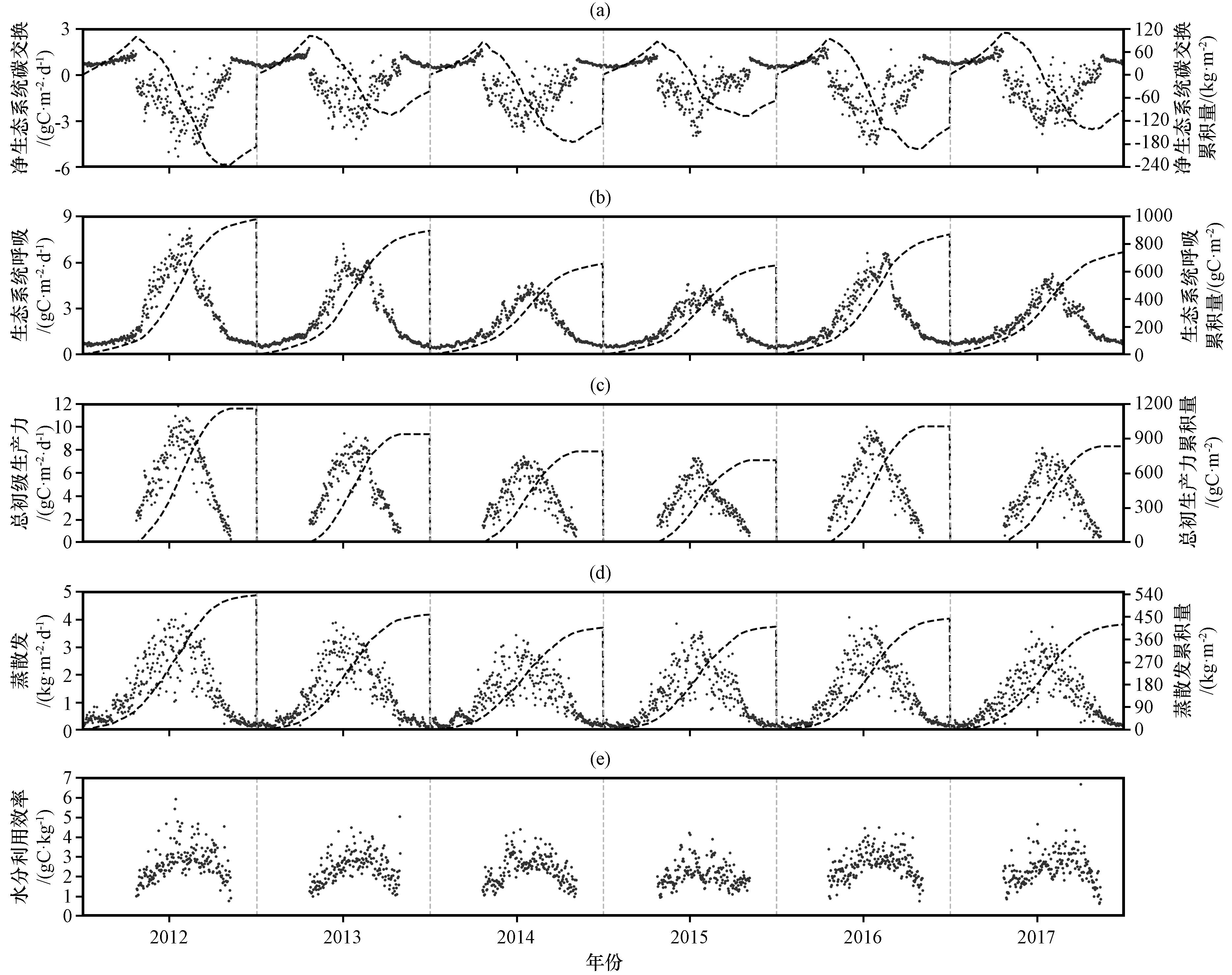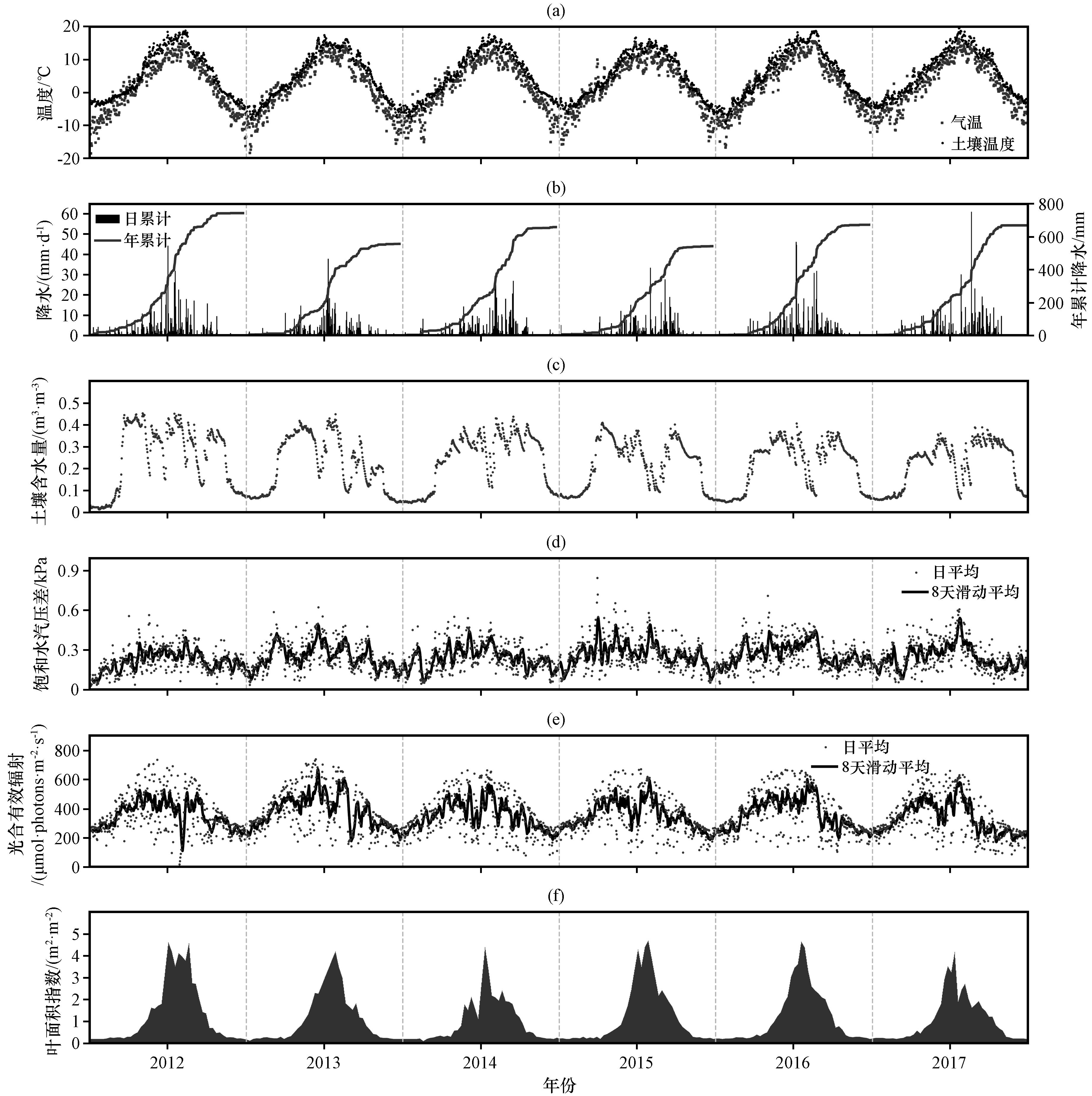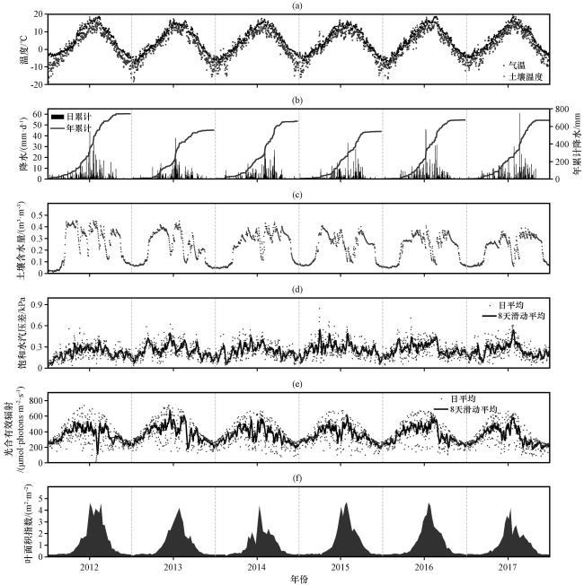 图1 2012 -2017年环境因子季节变化特征(a)气温(Ta)和土壤温度(Ts), (b)日降水(PRE)和年累计降水, (c)土壤含水量(SWC), (d)日平均及8天滑动平均饱和水汽压差(VPD), (e)日平均及8天滑动平均光合有效辐射(PAR), (f)叶面积指数(LAI) Fig.1 Seasonal variation characteristics of environmental factors in 2012 -2017, (a)air temperature (Ta) and soil temperature (Ts), (b)daily and cumulative precipitation (PRE), (c)soil water content (SWC), (d)vapor pressure deficit (VPD), (e)photosynthetically active radiation (PAR), (f) leaf area index (LAI) |