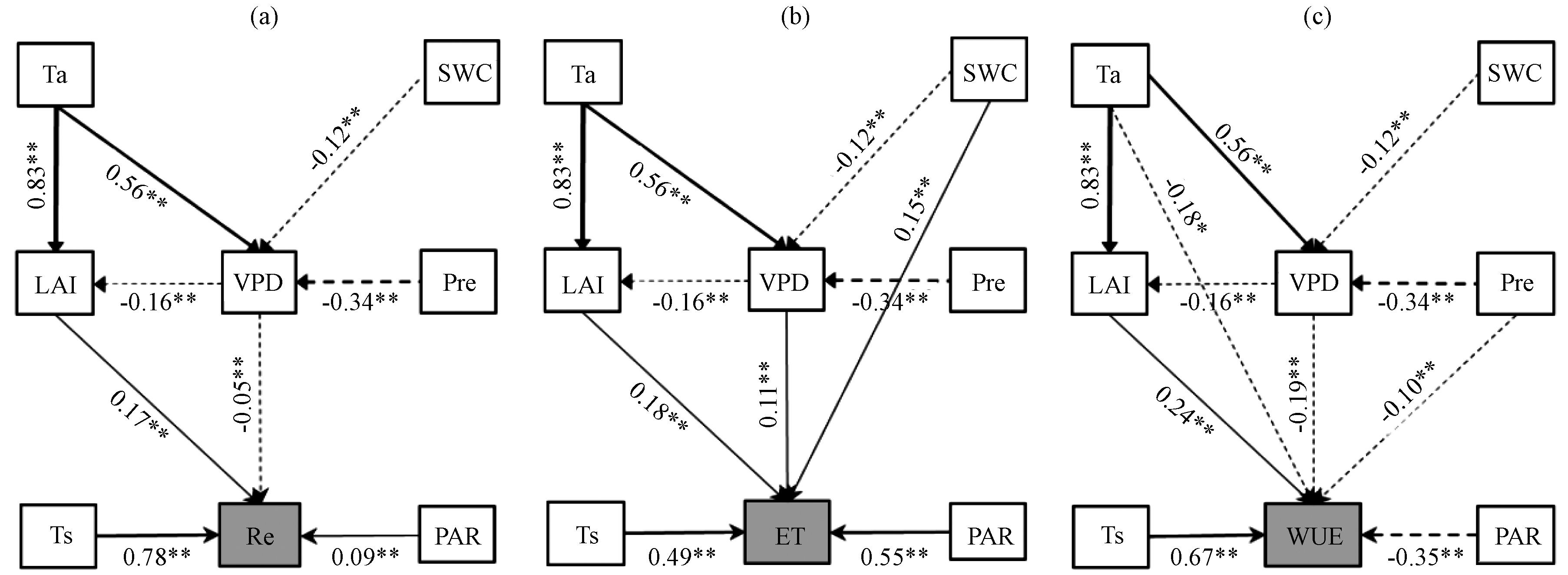 图6 2012 -2017年生长季日Re (a)、 ET (b)和WUE (c) 的结构方程模型实线和虚线表示正、 负效应, 数值表示标准路径系数, “**”表示p<0.01, “*”表示p<0.05 Fig.6 Structural equation models for daily Re (a), ET (b) and WUE (c) during the growing season in 2012 -2017.Solid and dotted lines represent positive and negative paths, and values are the standard path coefficient.“**” represent p<0.01 and “*” represent p<0.05 |