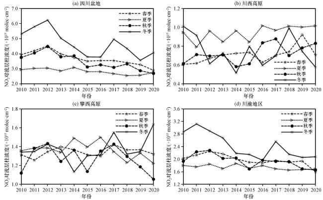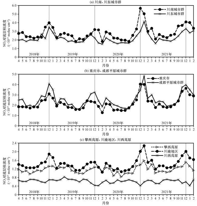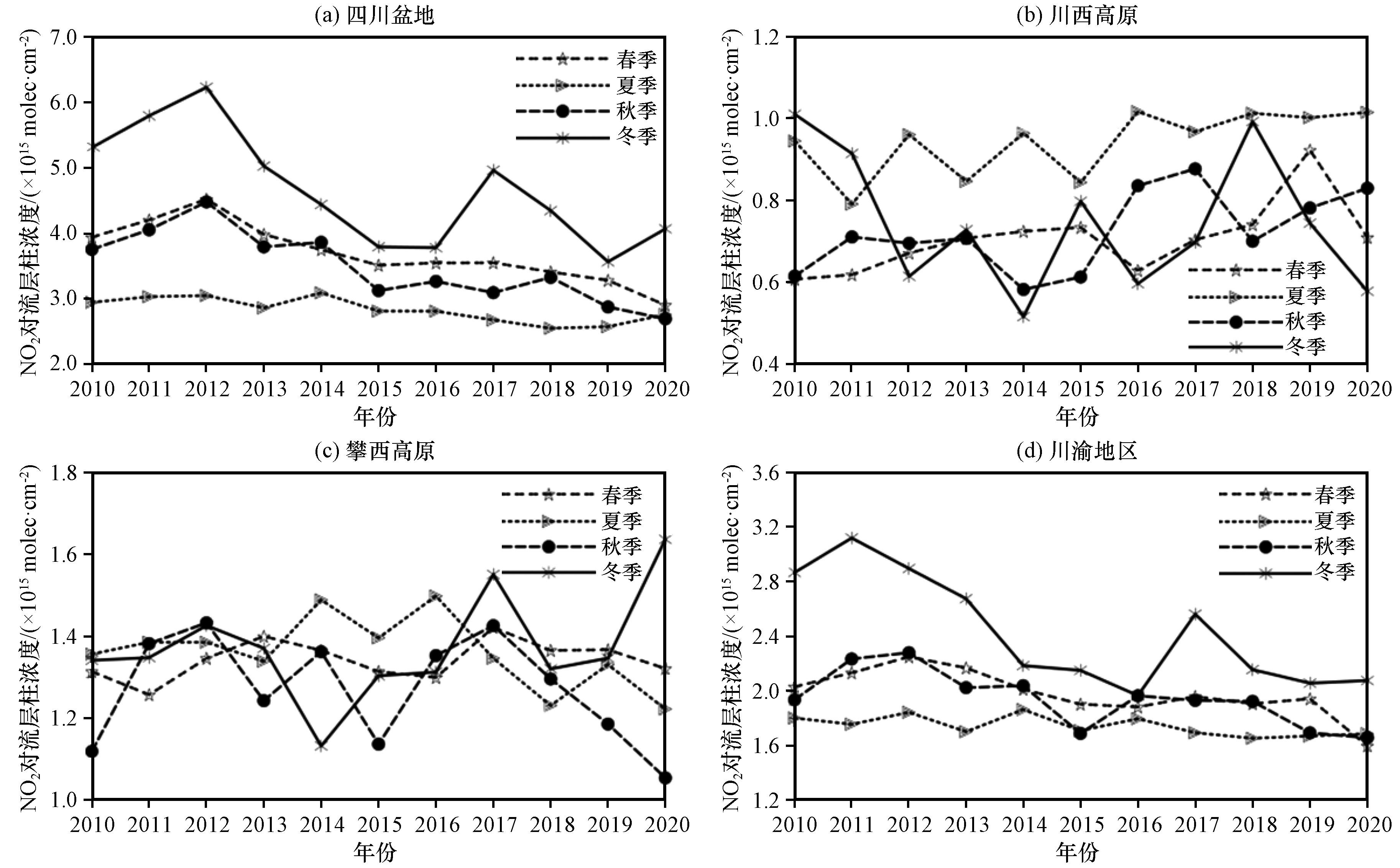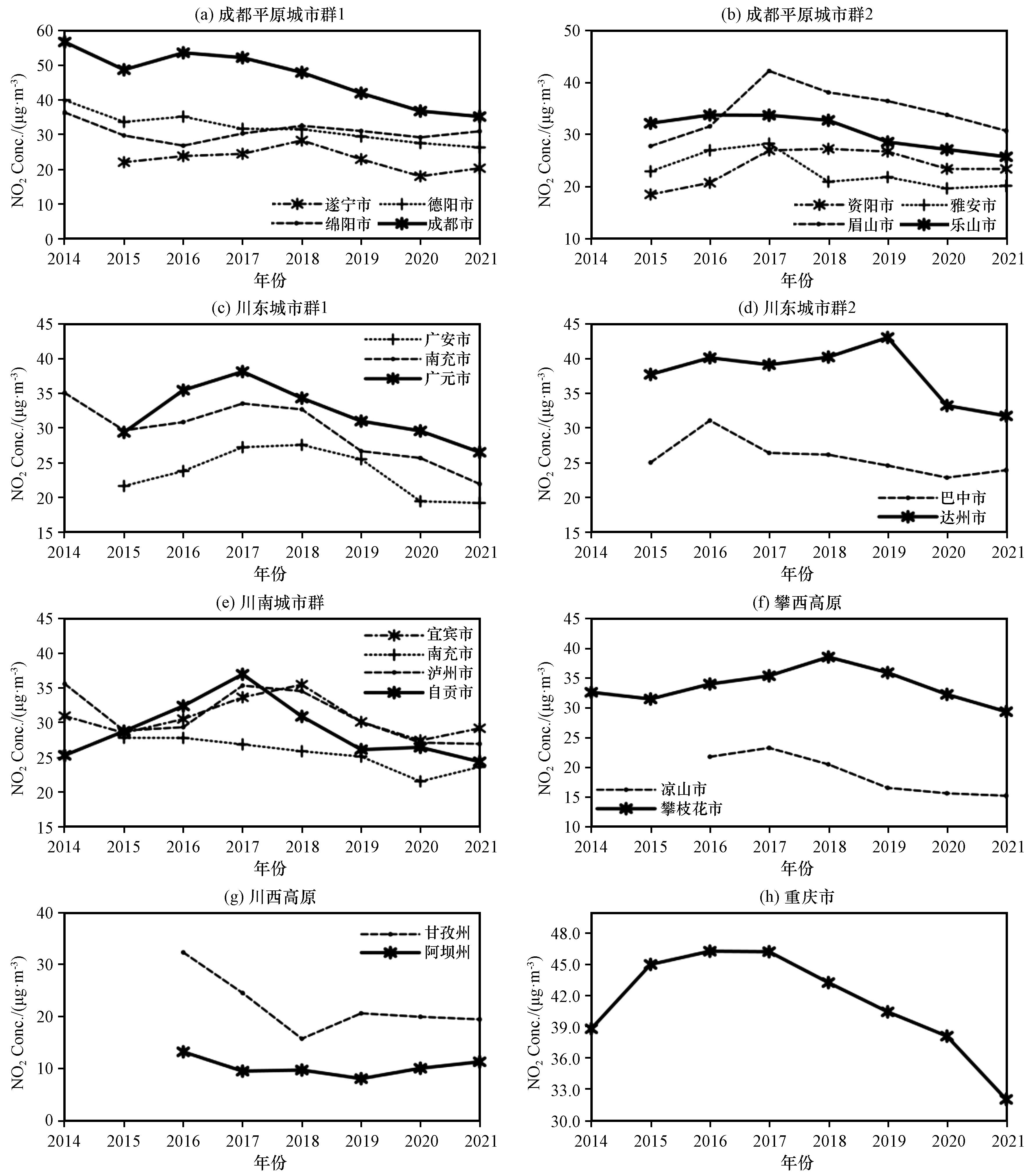 2年均浓度保持稳定外, 其余三个城市的变化趋势与成都平原一致, 呈现先上升后下降的趋势。川东[