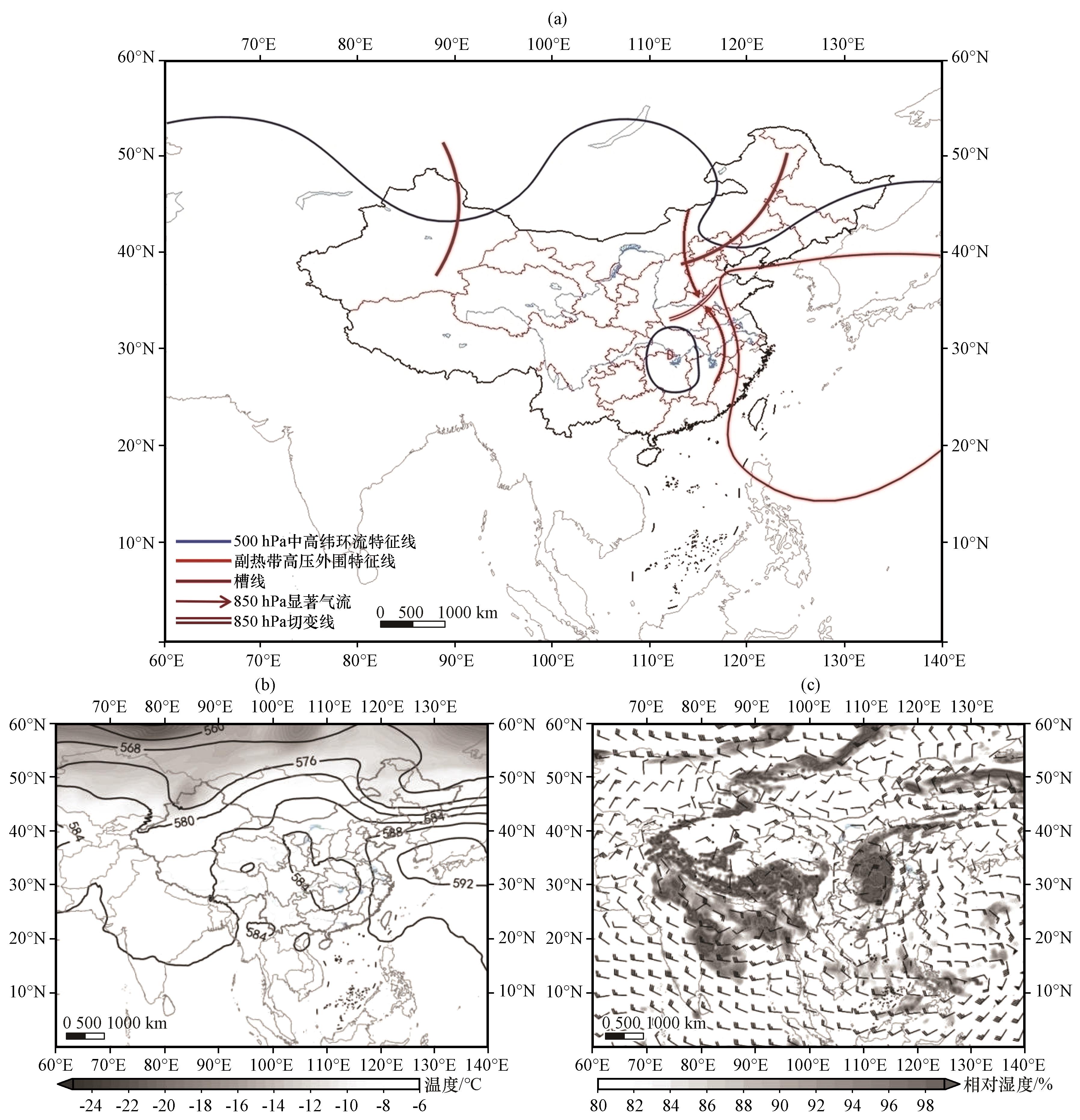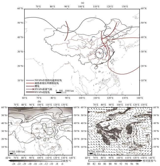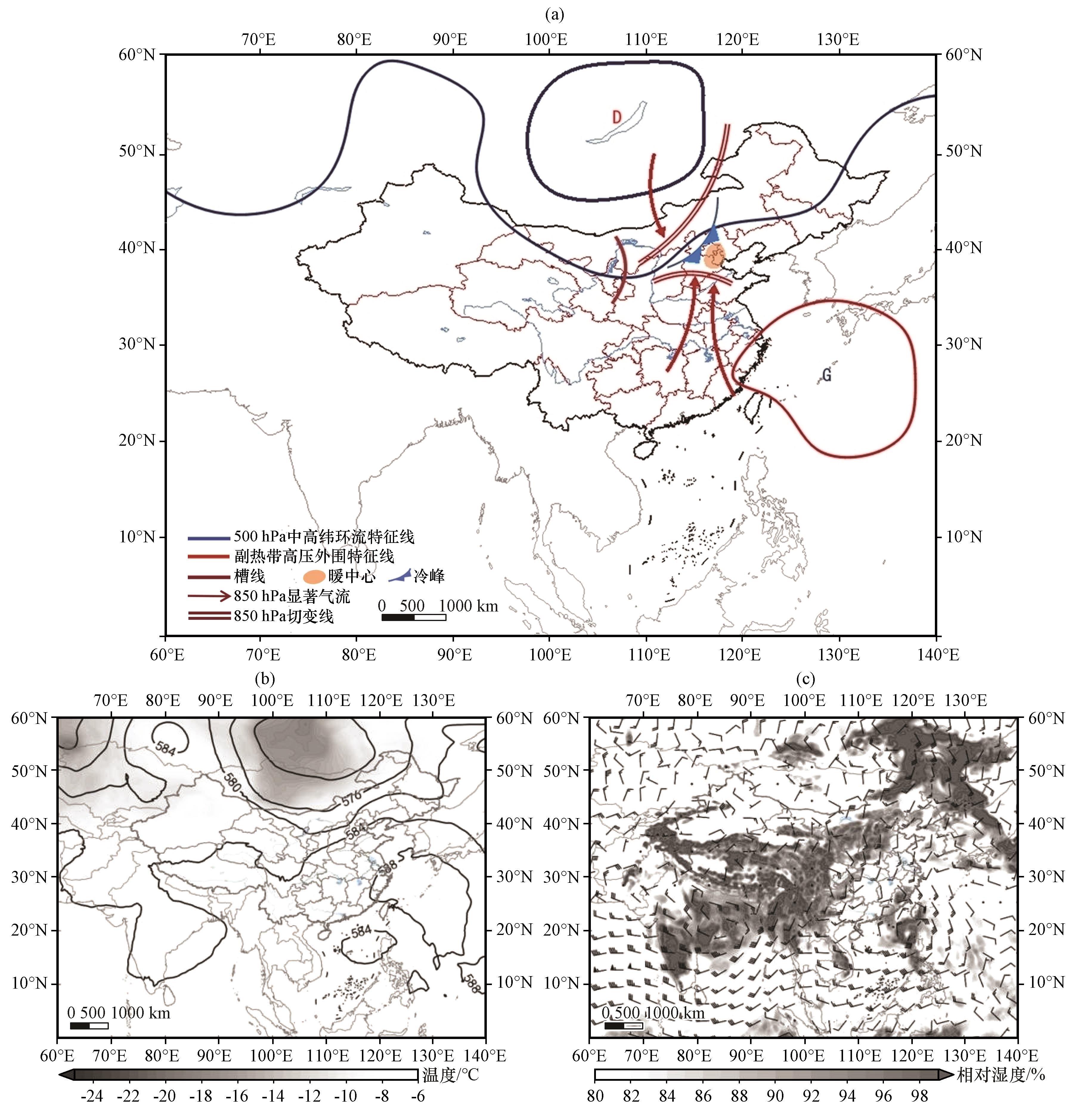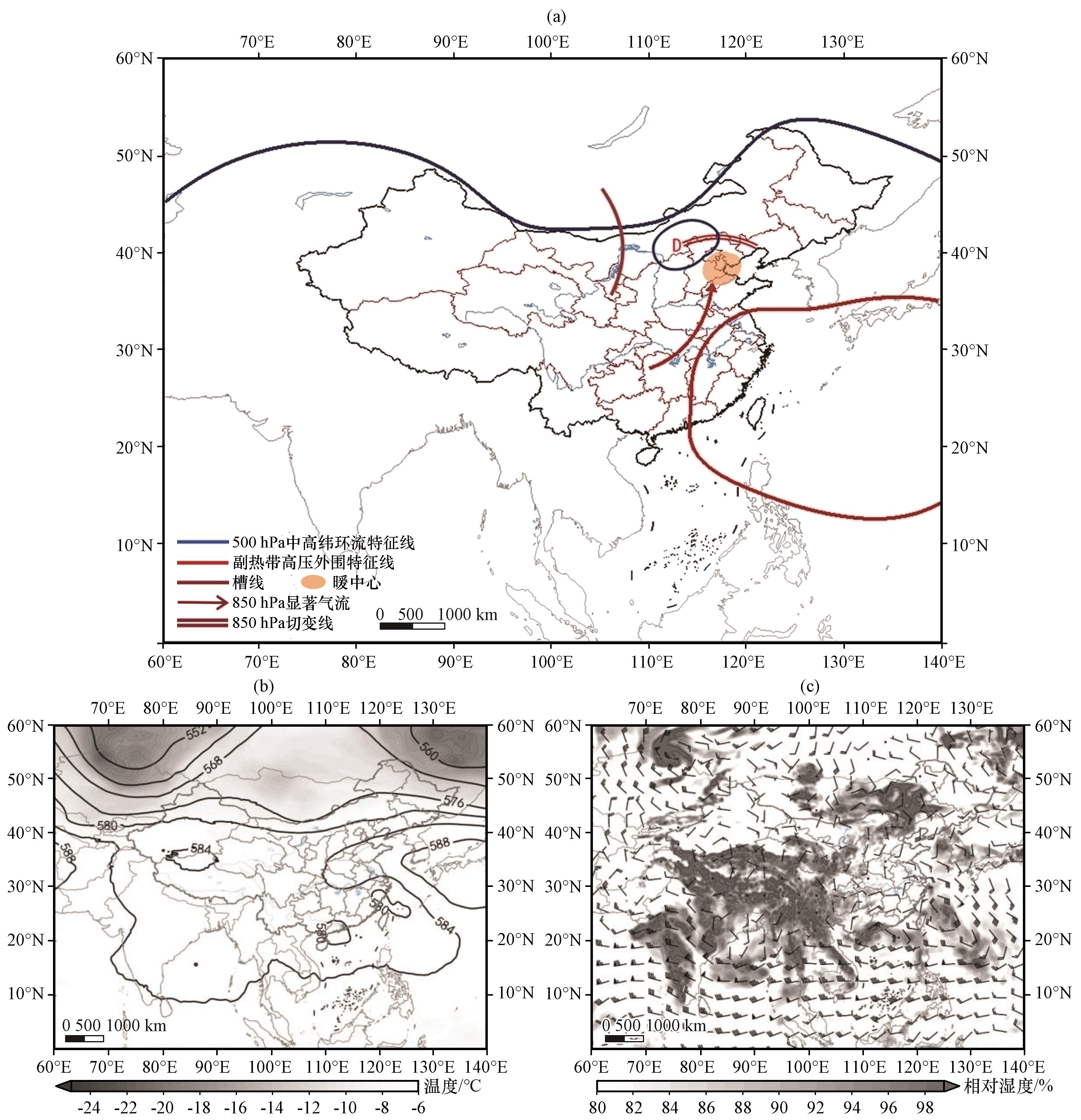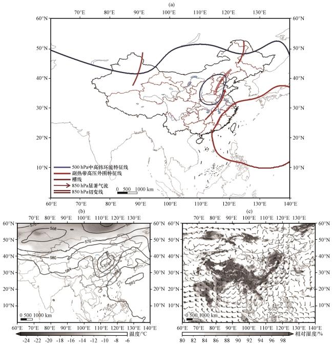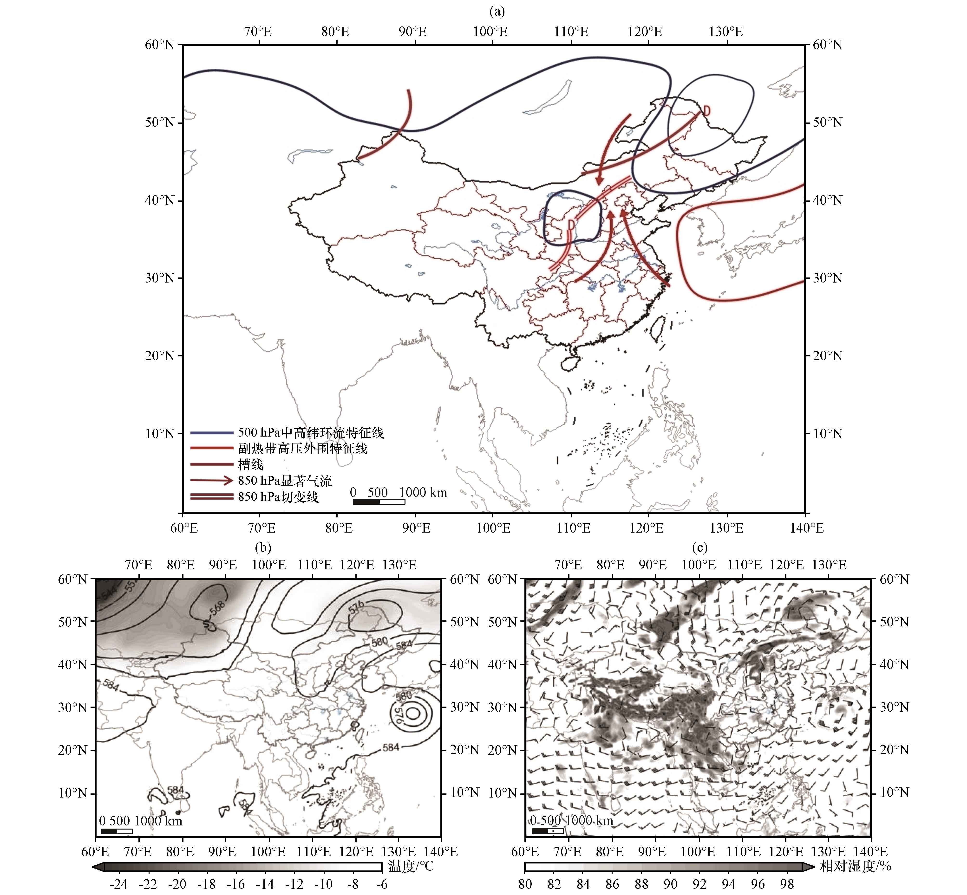 图8 海河流域高空槽型天气学模型(a); 2018年8月12日08:00 500 hPa位势高度场(黑色等值线, 单位: dagpm)和温度(阴影, 单位: ℃)(b); 850 hPa风场(风向杆, 单位: m·s-1)和相对湿度(阴影, 单位: %, 显示部分为相对湿度大于80%的区域)(c)Fig.8 Synoptic model of high-altitude trough pattern in the Haihe River Basin (a); 500 hPa potential height field (black contour, unit: dagpm) and temperature (shaded, unit: °C) (b); 700 hPa wind field (wind direction rod, unit: m·s-1) and relative humidity (shaded, unit: %, display part is relative humidity greater than 80%)(c) at 08:00 on August 12, 2018 |
