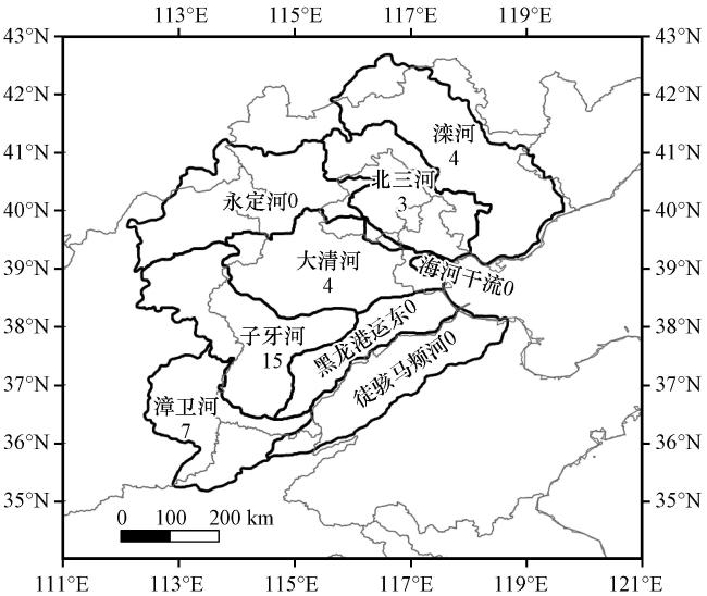 图3 海河流域9个分区(黑色实线)中历史洪水频数(数字, 单位: 次)的空间分布Fig.3 Spatial distribution of historical flood frequencies(unit: times) in 9 Division(indicated by black solid lines) of the Haihe River Basin |