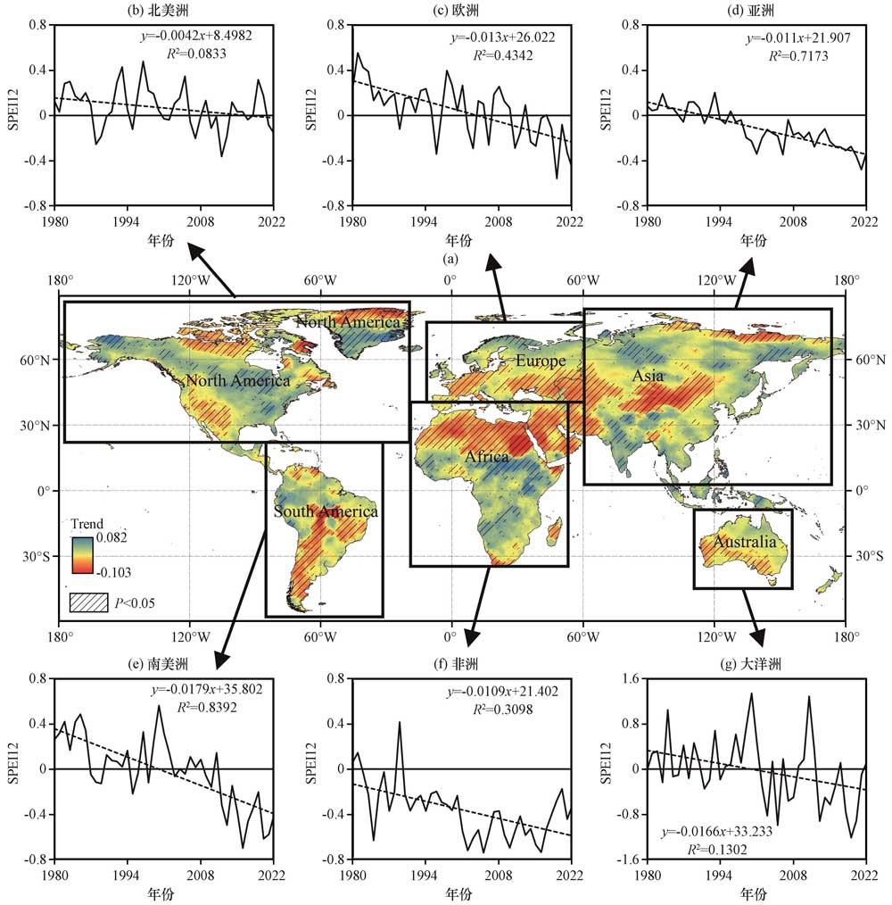 图2 1980 -2022年全球SPEI 12年均值的时空变化特征(a)及六大洲干旱度变化趋势(b~g)(b)北美洲, (c)欧洲, (d)亚洲, (e)南美洲, (f)非洲, (g)大洋洲; 黑色斜线区域表示相关系数通过了0.05显著性水平的检验 Fig.2 Characteristics of spatial and temporal variations of the global SPEI 12 year average from 1980 to 2022 (a) and trends of aridity in six continents (b~g).(b) North America, (c) Europe, (d) Asia, (e) South America, (f) Africa, (g) Oceania, The black diagonal area indicates that the correlation coefficient passed the test at the 0.05 significance level |