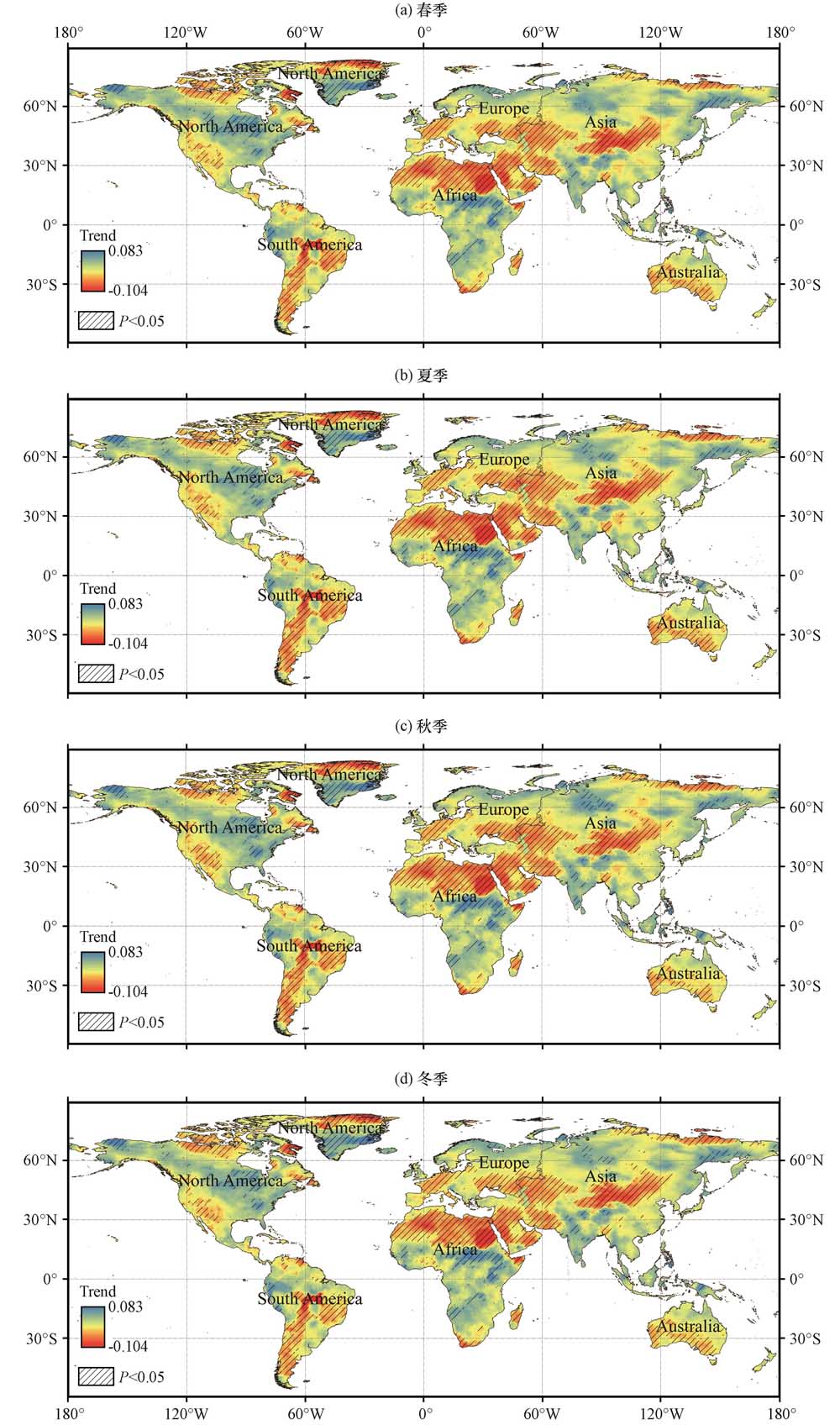 图4 1980 -2022年全球SPEI12年均值在不同季节的空间变化趋势(a)春季, (b)夏季, (c)秋季, (d)冬季; 黑色斜线区域表示相关系数通过了0.05显著性水平的检验 Fig.4 Spatial trends of global SPEI12 annual mean values in different seasons from 1980 to 2022(a) spring, (b) summer, (c) autumn, (d) winter.The black slash area indicates that the correlation coefficients passed the test at the 0.05 significance level |