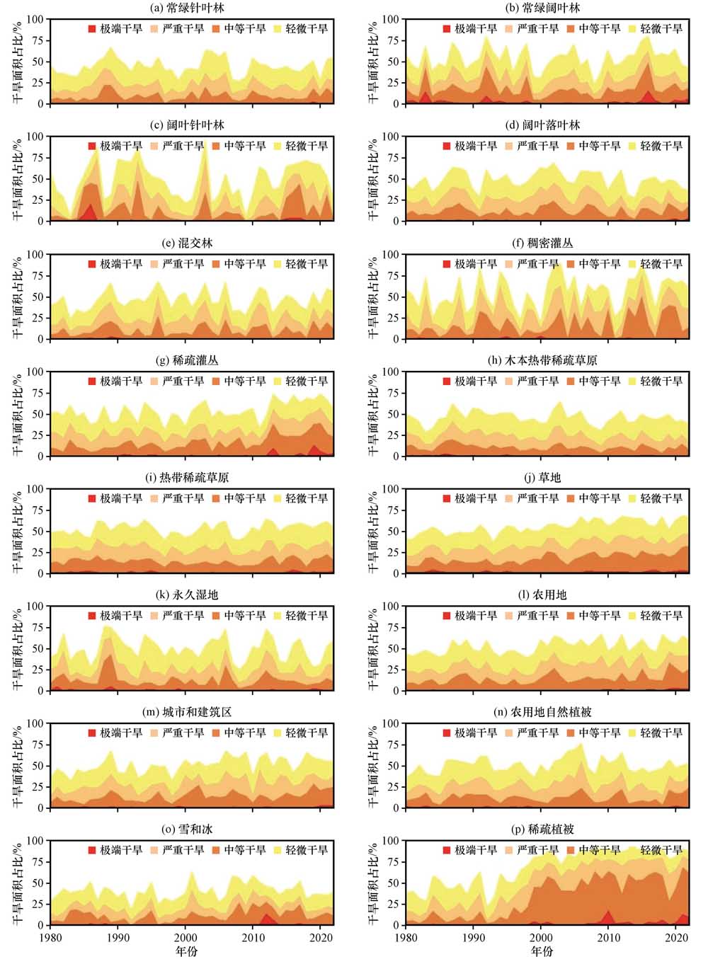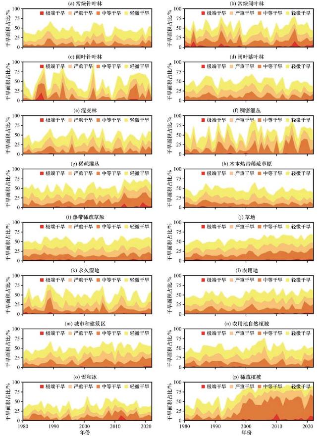 图7 1980 -2022年不同植被覆盖类型区干旱面积占比的变化特征(a)常绿针叶林, (b)常绿阔叶林, (c)落叶针叶林, (d)落叶阔叶林, (e)混交林, (f)稠密灌丛, (g)稀疏灌丛, (h)木本热带稀疏草原, (i)热带稀疏草原, (j)草地, (k)永久湿地, (l)农用地, (m)城市和建筑区, (n)农用地自然植被, (o)雪和冰, (p)稀疏植被 Fig.7 Variation characteristics of the proportion of drought-prone areas for different vegetation cover types from 1980 to 2022(a) Evergreen Needleleaf Forest, (b) Evergreen Broadleaf Forest, (c) Deciduous Needleleaf Forest, (d) Deciduous Broadleaf Forest, (e) Mixed Forest, (f) Closed Shrubland, (g) Open Shrubland, (h) Woody Savannas, (i) Savannas, (j) Grassland, (k) Permanent Wetland, (l) Cropland, (m) Urban and Built-Up, (n) Cropland/Natural Vegetation Mosaic, (o) Snow and Ice, (p) Barren or Sparsely Vegetated |