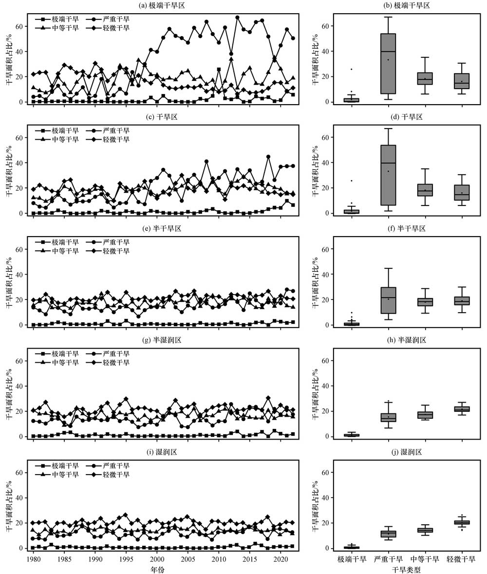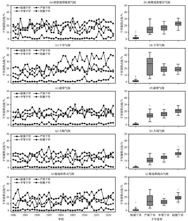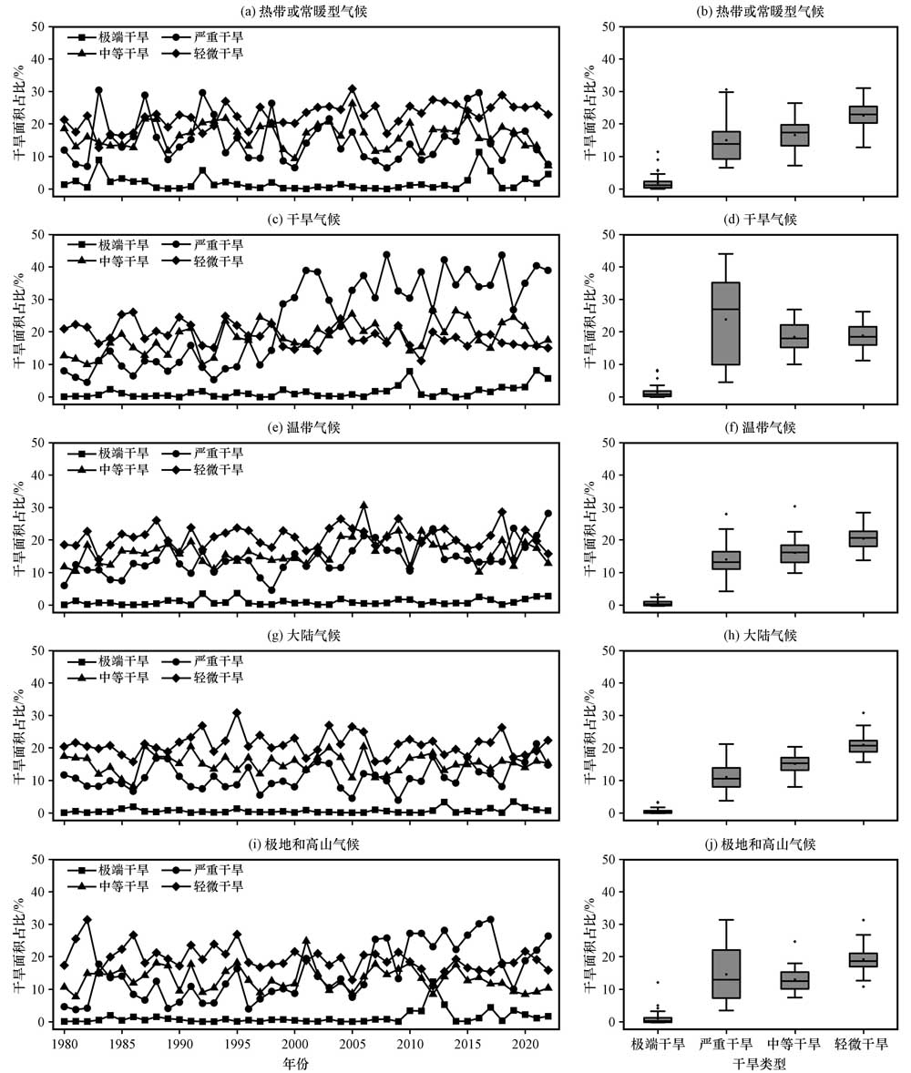 图9 全球陆地不同气候区的不同干旱程度面积占比年际变化趋势(a, c, e, g, i)及比较(b, d, f, h, j)(a, b)热带或常暖型气候, (c, d)干旱气候, (e, f)温带气候, (g, h)大陆气候, (i, j)极地和高山气候 Fig.9 Interannual trends in the area share of different degrees of aridity in different climatic zones of the global land mass (a, c, e, g, i) and comparisons (b, d, f, h, j).(a, b) Tropical or often warm climates, (c, d) Arid climates, (e, f) Temperate climates, (g, h) Continental climates, (i, j) Polar and alpine climates |