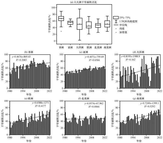 图3 基于SPEI12年均值的全球各大洲干旱区面积占比比较(a), 六大洲干旱区面积占比(b~g)(b)非洲, (c)亚洲, (d)大洋洲, (e)欧洲, (f)北美洲, (g)南美洲 Fig.3 Comparison of the area share of arid zones in each continent globally based on SPEI 12 year averages (a), and the area share of arid zones in six continents (b~g).(b) Africa, (c) Asia, (d) Oceania, (e) Europe, (f) North America, (g) South America |