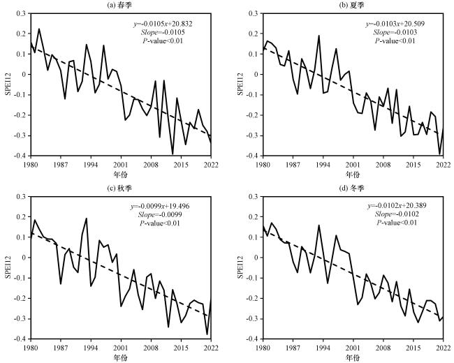 表2 1980 -2022年全球各季SPEI12趋势的面积百分比Table 2 The percentage trend of global seasonal SPEI12 from 1980 to 2022 |