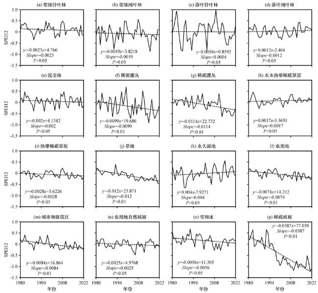 图8 1980 -2022年不同土地覆盖类型区SPEI指数年均值的年际变化趋势(a)常绿针叶林, (b)常绿阔叶林, (c)落叶针叶林, (d)落叶阔叶林, (e)混交林, (f)稠密灌丛, (g)稀疏灌丛, (h)木本热带稀疏草原, (i)热带稀疏草原, (j)草地, (k)永久湿地, (l)农用地, (m)城市和建筑区, (n)农用地自然植被, (o)雪和冰, (p)稀疏植被 Fig.8 The SPEI trend across different land cover types from 1980 to 2022.(a) Evergreen Needleleaf Forest, (b) Evergreen Broadleaf Forest, (c) Deciduous Needleleaf Forest, (d) Deciduous Broadleaf Forest, (e) Mixed Forest, (f) Closed Shrubland, (g) Open Shrubland, (h) Woody Savannas, (i) Savannas, (j) Grassland, (k) Permanent Wetland, (l) Cropland, (m) Urban and Built-Up, (n) Cropland/Natural Vegetation Mosaic, (o) Snow and Ice, (p) Barren or Sparsely Vegetated |