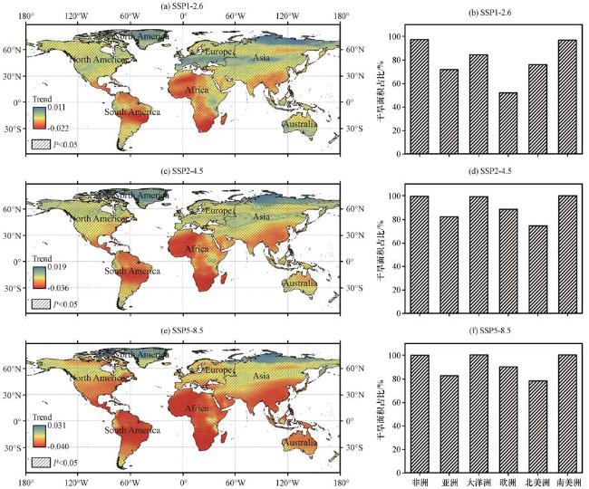 图12 2016 -2100年三种SSP情景下SPEI 12年均值的空间变化趋势(a, c, e)及各大洲干旱面积占比(b, d, f)(a、 b) SSP1-2.6, (c、 d) SSP2-4.5, (e、 f) SSP5-8.5; 黑色斜线区域表示相关系数通过了0.05显著性水平的检验 Fig.12 Spatial trends of SPEI12 annual mean values under three SSP scenarios from 2016 to 2100(a, c, e) and the percentage of drought area in each continent (b, d, f).(a, b) SSP1-2.6, (c, d) SSP2-4.5, (e, f) SSP5-8.5.The black diagonal area indicates that the correlation coefficients passed the test at the 0.05 significance level |