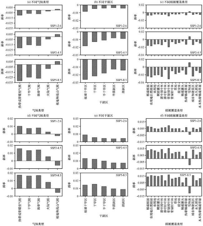 图13 2016 -2100年三种SSP情景下SPEI指数(a, b, c)与干旱面积占比(d, e, f)在不同地理条件下随时间变化的斜率统计(a, d)不同气候类型, (b, e)不同干湿区, (c, f)不同植被覆盖类型 Fig.13 Slope statistics of SPEI index (a, b, c) versus percentage of dry area (d, e, f) over time under different geographical conditions for three SSP scenarios, 2016 -2100.(a, d)different climate types, (b, e) different dry and wet areas, (c, f) different vegetation cover types |