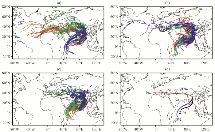 Backward trajectories of the moisture at the Naqu region in June (a), July (b) and August (c), trajectory clustering and the corresponding percentage of the number of tracks from June to August (d) in 2014.Red represents the first ten-day period of a month, green represents the midmonth, blue represents the last ten-day period of a month