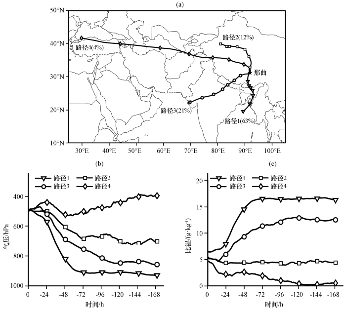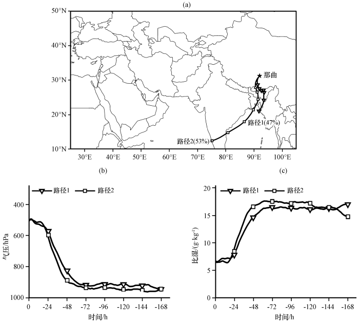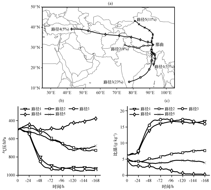 2014年夏季那曲地区中雨水汽输送路径空间分布(a)及气压(b)和比湿(c)的变化