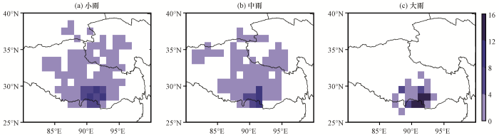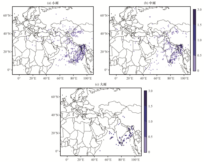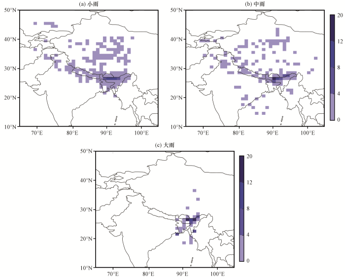 综上所述, 不同等级降水1天和3天前的水汽来源大值区分别都来自雅鲁藏布江、 印度与不丹的交界, 而7天前水汽来源的大值区有所区别, 大雨的水汽来源较小雨和中雨更集中。根据7天前水汽贡献的分布可以大体确定水汽的源地, 小雨的水汽源地为阿拉伯海、 孟加拉湾、 印度、 新疆以及中亚地区; 中雨的水汽源地为印度洋、 阿拉伯海、 孟加拉湾、 印度、 新疆以及中亚地区; 大雨的水汽源地为阿拉伯海和孟加拉湾。根据贡献率的大小, 可知夏季来自海洋的水汽输送对高原地区的降水具有重要贡献。同时, 水汽贡献分布集中的区域与水汽轨迹追踪的终点也有较好的对应关系。