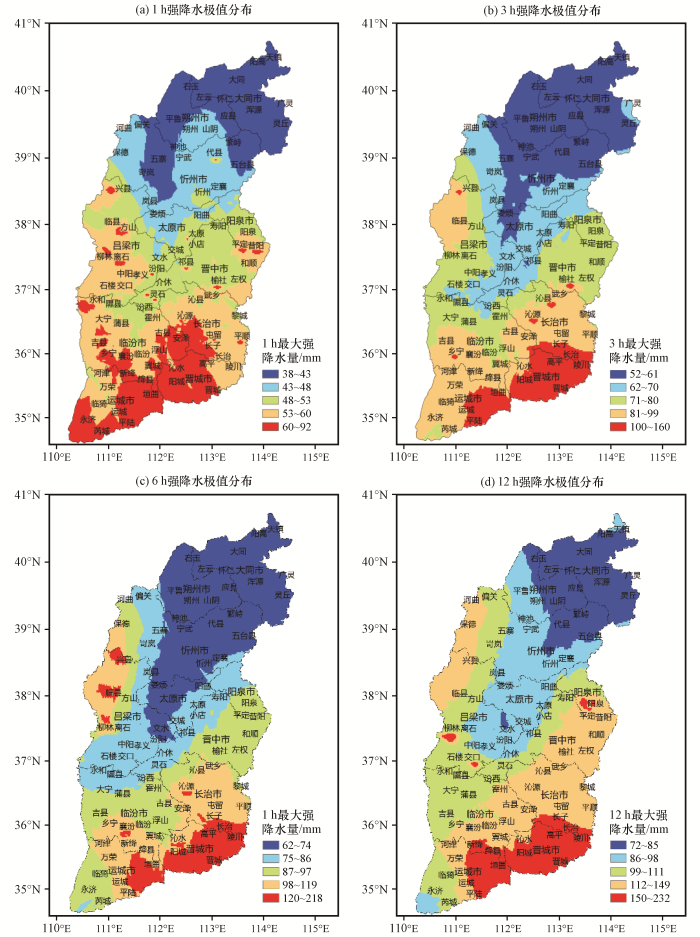 (1) 各站历史最大1 h、 3 h、 6 h、 12 h雨强分别为31.1~91.7 mm、 40.8~157 mm、 56.0~217.3 mm、 62.7~231.8 mm; 1 h>60 mm、 3 h>100 mm、 6 h>120 mm及12 h>150 mm的雨强极值主要分布在山西中南部的太行山区、 中条山、 吕梁山等区域; 具有簸箕型地形的运城市垣曲县是1 h>60 mm、 3 h>100 mm、 6 h>120 mm、 12 h>200 mm雨强极值的集中出现地域; 极值空间分布具有时效越短, 极值分布的局地性越强的特点。