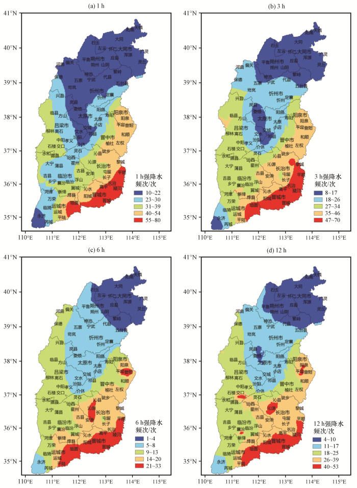 由1981 -2018年不同历时强降水出现频次空间分布(图2)可知, 12 h内的不同历时强降水出现的频次分布基本呈现出“南多北少、 山区多于盆地、 东南明显集中”的特点。受纬度(热力)、 地形(迎风坡抬升)、 水汽输送等因素影响, 局地强降水多发区域分布明显集中在山西省运城东部、 晋城大部、 长治部分(沁源、 沁县、 平顺)、 临汾(东、 西两山)、 晋中的榆社、 阳泉的平定、 吕梁(兴县、 临县、 交口等地)。