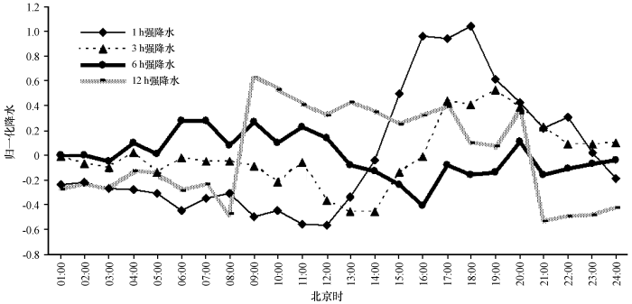 1981 -2018年山西省归一化的不同历时强降水量日变化