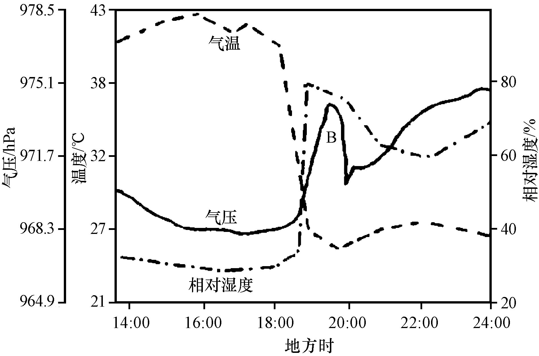 | 图3 19710716美国菲尼克斯飑线沙尘暴地面要素变化曲线(引自Idso et al, 1972) |