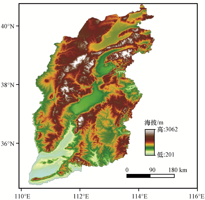 选取英国东英吉利(East Anglia)大学气候研究中心(CRU)开发的CRU-TS3.25逐月气温数据集(任余龙等, 2012), 时间尺度1901 -2016年(共116年), 空间分辨率为0.5°×0.5°, 主要包含平均、 最高和最低温度、 降水、 云量等变量(Mitchell and Jones, 2005)。本研究从CRU数据集中提取山西区域内气温数据, 并利用双线性插值法将CRU数据插值到0.1°×0.1°格点。文中涉及的地图是基于国家测绘地理信息局标准地图服务网站下载的审图号为GS2017(1267)的中国分省地图——山西省地图制作, 底图无修改。
