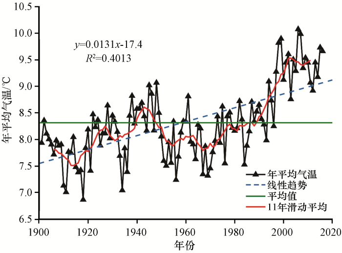 气温是气候变化研究的最基本要素之一, 政府间气候变化专门委员会(Intergovernmental Panel on Climate Change, IPCC)的第五次气候变化评估报告显示, 近百年来全球气温变化都呈明显的升高趋势, 预计至21世纪末, 温度升幅可能在1.0~3.7 ℃(丁一汇和王会军, 2016; Stocker et al, 2014)。在全球变暖的背景下, 分析气温的变化特征及趋势, 既可有助于预测未来气温变化, 也可为合理利用气候热量资源, 改善农业生产结构, 促进生态环境保护、 社会经济发展、 预防农业灾害提供决策方面的指导(易湘生等, 2011; 古晓红等, 2015; 刘永婷等, 2017)。