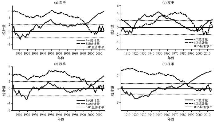 由图5(a)可知, 山西近百年春季均温在20世纪20年代中期之前主要呈现下降趋势, 之后开始回暖。40年代增温明显, 而50~70年代中期气温缓慢下降, 之后又进入缓慢增温期。90年代中期以后, 气温持续快速上升, 处于在116年中最暖期。虽然UF与UB曲线交点对应时刻在1993年, 但由于交点不在临界线之间, 所以需借助滑动t检验方法验证春季暖突变的开始时间, 发现该交叉点通过0.01的信度检验, 说明山西春季季均温在1993年发生暖突变。夏季[图5(b)]UF曲线正负波动变化表明, 山西116年夏季气温呈现升降交替变化。20世纪20年代中期至50年代, 增暖趋势显著; 90年代末气温上升, 但没有出现显著增温现象。从图5(b)中可以看出, UF与UB有三个交叉点, 具体时间分别是1917年、 1954年和1996年, 可以确定1917年是气温突变开始的时间, 但是第二个交叉点不在临界线之间, 第三个交叉点之后UF曲线未明显超过临界线, 气温变化不显著, 所以第二、 三突变点的真伪需要进一步判别, 通过滑动t检验方法进行进一步验证, 发现第二交叉点(1954年)未通过0.01的信度检验、 第三交叉点(1996年)通过0.01的信度检验, 所以在1917年和1996年夏季季均温发生突变。秋季[图5(c)]季均温总体上呈升高趋势, 在21世纪初之前, UF低于0.05显著水平, 气温上升趋向不明显, 之后, UF位于临界线之外, 气温上升趋向明显, 在2001年出现暖突变。冬季[图5(d)]气温变化趋势有明显的下降和上升的两个阶段: 20世纪40年代以前, 气温下降趋势显著; 20世纪90年代以后, 增温现象显著, UF和UB有一个交点在临界线范围之内, 冬季气温暖突变开始的时间是1984年。
