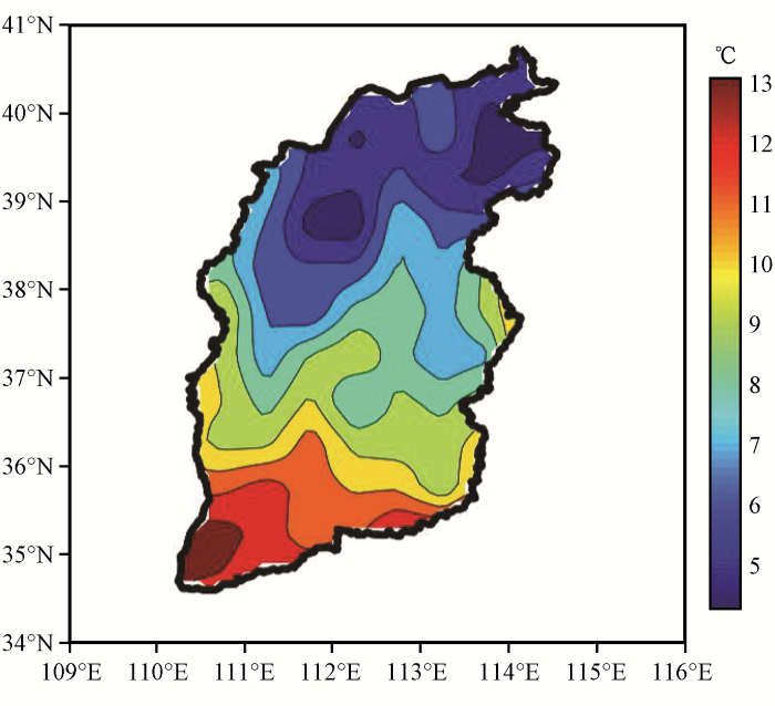 山西百年气温的空间分布差异显著, 具有南高北低的气温空间分布特征, 多年平均气温自西南向东北递减(图6)。山西年均温较高区域主要位于临汾盆地一带, 温度在12~13 ℃, 西南部气温最高, 年均温可达13 ℃以上。山西东北部的气温较低, 温度在5~6 ℃, 38.5°N以北气温较低, 温度在5 ℃以下, 最低气温为4.3 ℃。年均温等值线自低温中心向西南和东南方向凸出, 自高温中心向东北方向凸出。