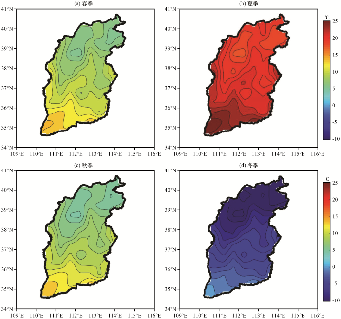 由1901 -2016年山西四季气温平均分布(图7)可知, 山西百年季均温空间变化呈现由西南向东北递减的趋势, 西部等温线向南凸, 说明与山西同纬度的其他地区相比, 该地区气温偏低。春季[图7(a)]气温的空间变化趋势与年均温的相似。西南部的季均温最高, 达到14 ℃以上; 东北部季均温最低, 气温低于6 ℃。夏季[图7(b)]气温明显升高, 高值区位于西南部, 气温可达25 ℃以上, 而东北部的季均温较低, 最低气温低于17.4 ℃。秋季[图7(c)]气温空间变化也呈现西南高、 东北低, 自南向北逐渐降低的特点。西南部气温较高, 为12~14 ℃; 东北部为气温较低, 位于6 ℃左右, 最低值不足5 ℃。冬季[图7(d)]气温纬度变化规律性较其他明显, 气温随纬度增加而降低, 西南部气温可达0 ℃, 其他地区均低于0 ℃; 东北部季均温最低, 最低值在-10.8 ℃之下。