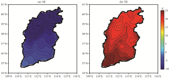 (3) 山西多年平均气温和季均温都具有南高北低的气温空间变化特点, 自西南向东北递减, 纬度变化规律受到复杂地形因素的影响。山西气温高值区位于西南部, 特别是运城盆地一带, 冬季气温高于0 ℃, 夏季气温高于25 ℃; 东北部是气温的低值区, 冬季气温低于-10.8 ℃, 夏季气温低于17.4 ℃。山西冬季气温空间分布特征受地形影响较小, 随纬度变化的规律性更加明显。 最冷月(1月)气温随纬度的升高而递减, 纬度地带性规律明显, 最热月(7月)的气温空间分布规律则相反。