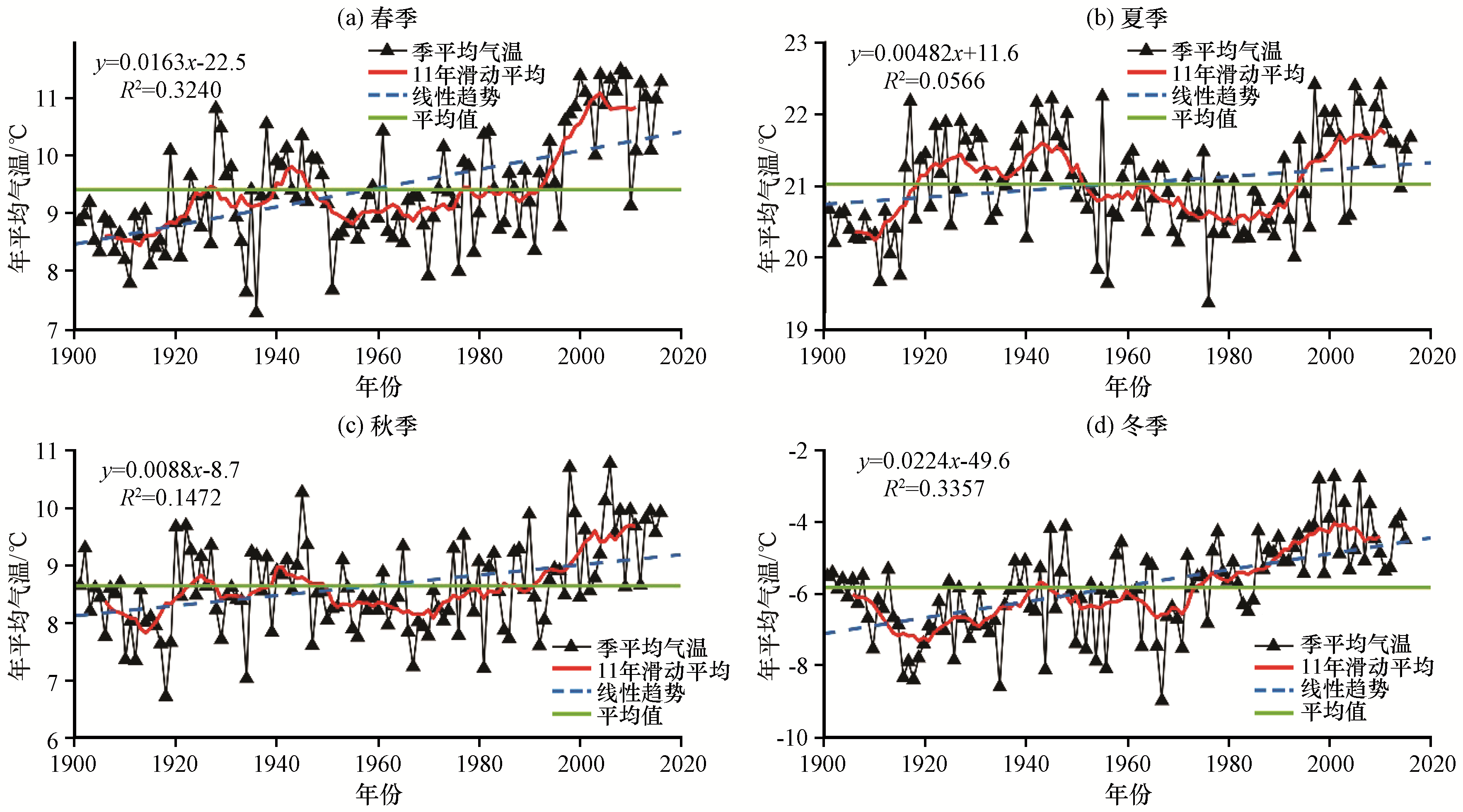 | 图4 1901 -2016年山西四季气温年际变化趋势 |