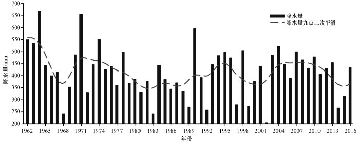 夏季, 山东平均降水量的常年值为401.2 mm, 由1962 -2016年平均降水量的年际、 年代际时间演变曲线(图1)可以看出, 夏季降水量的年际振荡显著并表现出年代际阶段性特征。降水量最大值出现在1964年, 为666.1 mm, 最小值出现在2002年, 为205.6 mm。20世纪60年代到70年代初, 降水量先减小后增加, 这一阶段的年际跃变较强, 之后到80年代中期降水呈振荡减小的年代际演变趋势、 年际波动较为平缓, 20世纪80年代末到21世纪初年际跃变加强, 随后降水以偏多为主、 年际波动减弱。