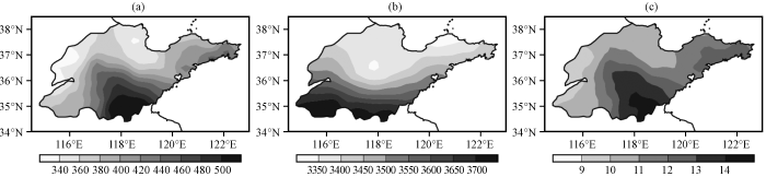 山东夏季降水量(a, 单位: mm)、 整层大气可降水量(b, 单位: mm)和降水转化率(c, 单位: %)的常年值空间分布