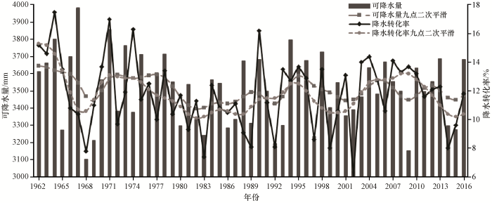 1962 -2016年夏季山东平均整层大气可降水量和降水转化率的时间演变曲线