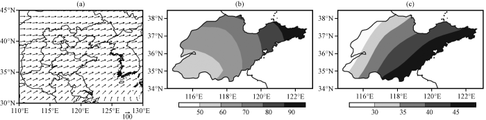 山东夏季水汽通量(a)、 纬向水汽通量(b)和经向水汽通量(c)的常年值空间分布[单位: kg·(m·s)-1]
