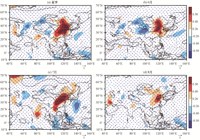 图5(b)~(d)考察了季节内各月的水汽输送对整个夏季降水的贡献, 3个月的相关分布有较大差异。6月[图5(b)], 最明显的两个相关区域分别为位于山东到东北地区的正中心和位于青藏高原到新疆的负中心, 表明来自西北太平洋上的暖湿气流与来自贝加尔湖以西的冷空气汇合造成降水偏多。7月[图5(c)], 位于中国东部的正相关区域呈东北-西南向的带状, 位于西北太平洋和菲律宾、 赤道附近的负相关系数明显增大, 显著的纬向水汽输送相关区域与季节的一致, 表明7月冷空气活动较弱, 而经向风分量将来源于热带太平洋、 西北太平洋和孟加拉湾的水汽输送至山东, 纬向风分量将上游的水汽输送至山东, 造成降水大范围偏多。8月[图5(d)], 正负相关系数都有所减小, 水汽主要来源于中国南海。