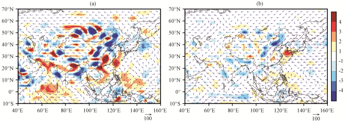根据王娜等(2019)挑选的山东夏季降水一致偏多的11个多雨年, 将降水量排在前5位的年份(1962, 1964, 1971, 1974和1990年)定义为降水异常偏多年, 其他6年(1963, 1978, 1994, 1995, 1998和2004年)为偏多年, 分别给出整层大气水汽通量的合成场。对比图7(a)和图7(b)可以看到, 无论是降水的异常偏多年和偏多年, 都有3支水汽来源, 分别为西北太平洋、 南海、 阿拉伯海至孟加拉湾上的水汽输送至山东。主要差异有三点: 一是在偏多年[图7(b)], 西北太平洋上表现出一致向西的水汽通量, 意味着副高外围南侧和西侧的气流将广阔西北太平洋上的水汽输送到山东, 特别是其东南地区表现出强的水汽辐合; 二是在异常偏多年[图7(a)], 菲律宾东部有明显的水汽通量辐散, 中国南海表现为显著的东北向水汽通量, 来自赤道太平洋的水汽与南海的水汽形成一条水汽通道向北输送至山东; 三是在异常偏多年, 60°E的赤道印度洋上有一个辐散中心, 向北输送的水汽在阿拉伯海上分为两支, 一支向东输送经孟加拉湾和中南半岛后与南海的水汽汇合, 另一支从印度半岛向东北方向输送, 此时在外蒙古有一个逆时针的水汽通量中心, 其南侧位于新疆和青藏高原大范围的偏西气流将来自印度半岛的水汽向东输送, 并于105°E附近与来自南海的水汽汇合共同输送向山东, 明显的水汽辐合区域处于山东的西部和南部。