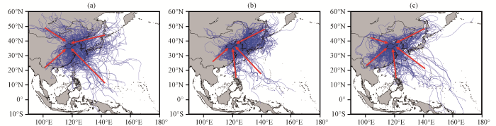 Traces maps of air mass that arrived at the Jinan station (blue line) during June (a), July (b) and August (c) in the 11 rainy years of summer precipitation over Shandong.The red arrow lines indicate crucial traces