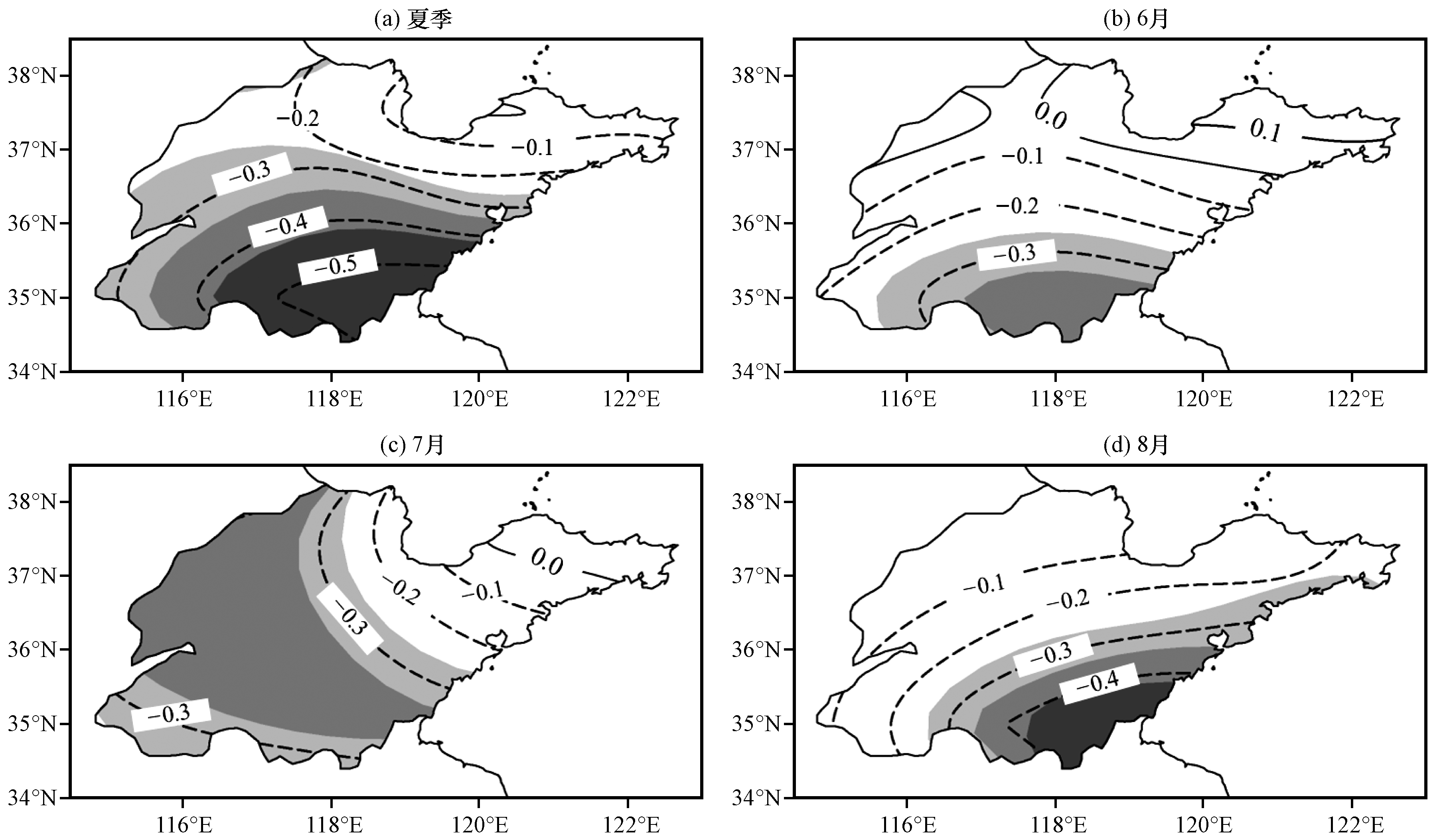 | 图6 夏季山东平均降水量与整层大气水汽通量散度的相关场(等值线) 浅灰色、 灰色到深灰色阴影区域分别表示通过0.05、 0.01和0.001显著性水平检验 |