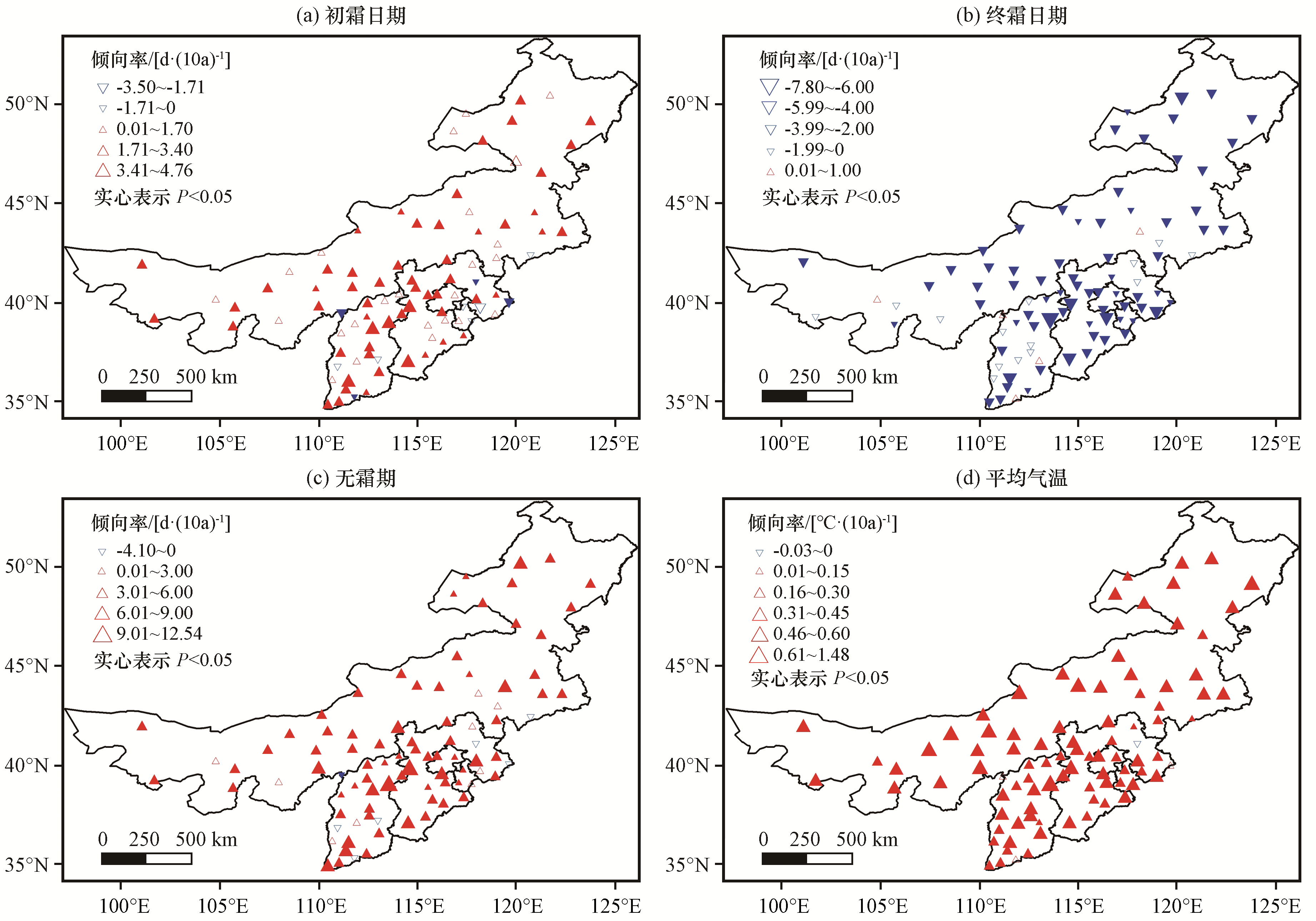 | 图4 1961 -2018年华北地区初、 终霜日、 无霜期和平均气温变化趋势的空间分布 |