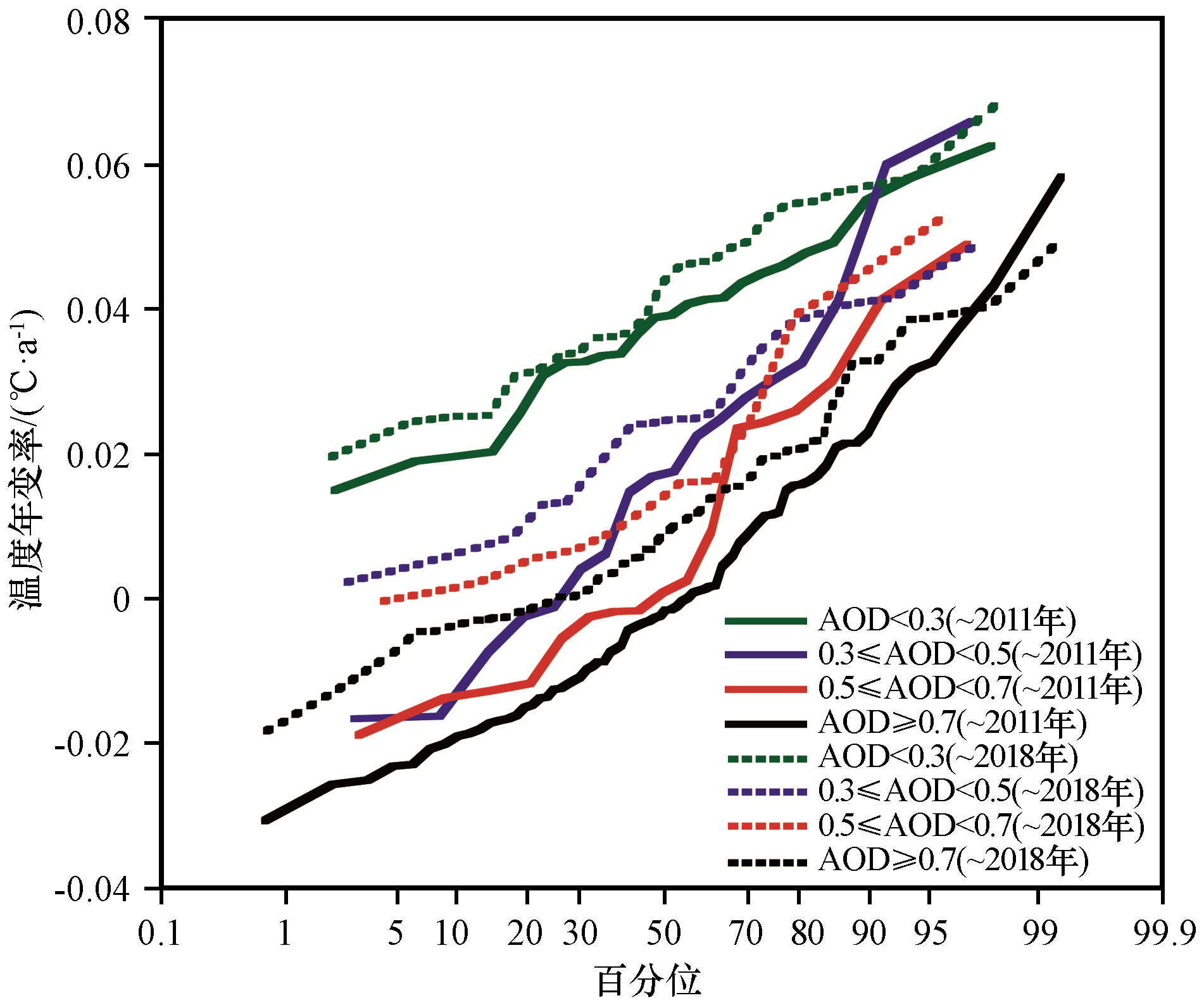 | 图4 建站至2011年和建站至2018年序列温度年变率按AOD分级的概率分布 |