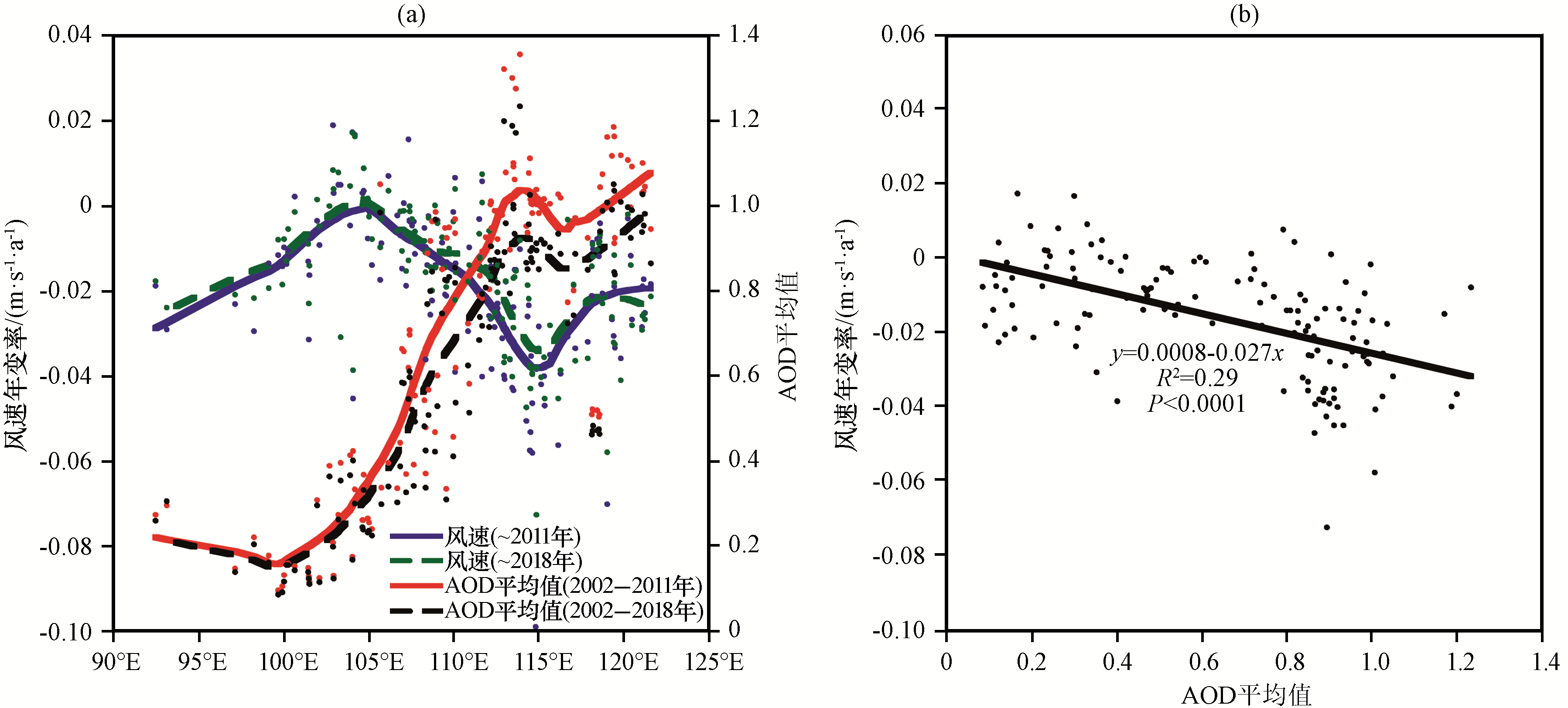 | 图5 建站至2011年和建站至2018年夏季风速年变率与2002 -2011年和2002 -2018年AOD平均值随经度的分布(a)及长时间序列的风速年变率和AOD均值的相关性图(b) |