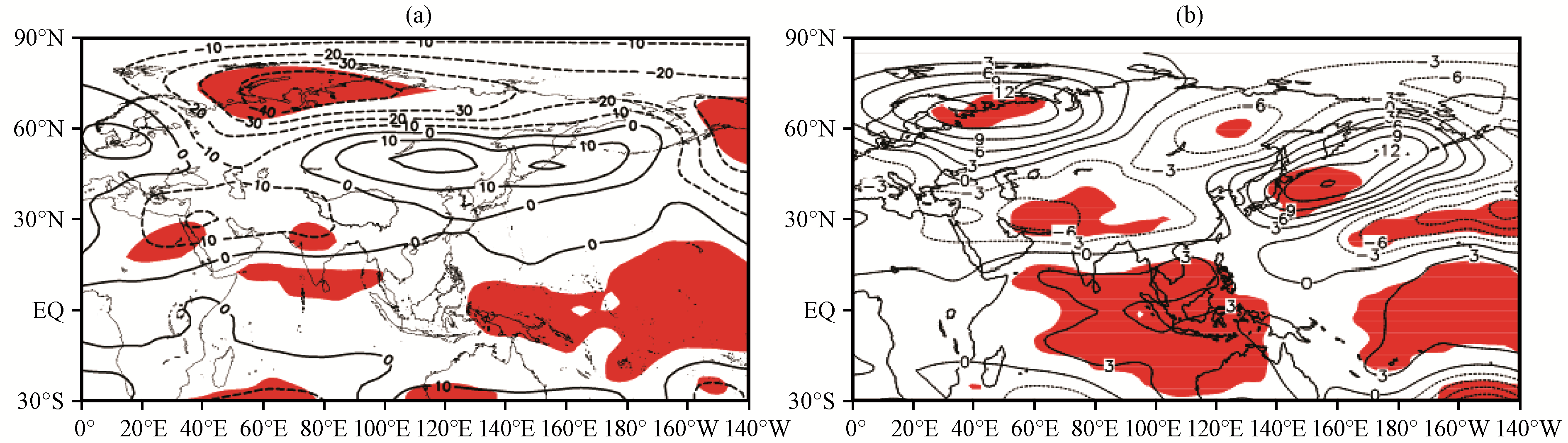 | 图6 冬半年典型多雪灾年500 hPa高度场合成异常场(a, 单位: ×10 gpm)及高度场对赤道太平洋第一空间模态的GEFA响应(b, 单位: ×10 gpm·℃-1) 阴影区为通过90%的显著性检验的区域 |