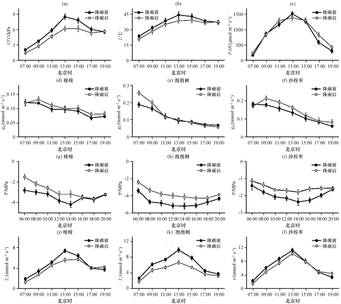 降雨前后饱和水汽压差VPD (a)、 气温T (b)、 光合有效辐射PAR (c)和3种灌木气孔导度gs (d~f)、 叶水势Ψ (g~i)及蒸腾速率Tr (j~l)的平均日变化