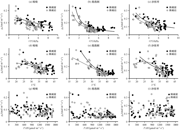 降雨前后3种灌木气孔导度(gs)与饱和水汽压差(VPD) (a~c)、 气温(T) (d~f)和光合有效辐射(PAR) (g~i)的关系
