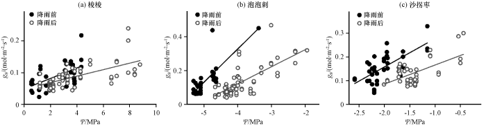 气孔导度对叶片水势的响应为线性函数(于贵瑞等, 2010), 降雨前后的拟合结果如表3, 相关性均达到了显著水平。3种荒漠植物的气孔导度随着叶水势的降低逐渐减小(图3), 随着蒸腾作用的持续进行, 叶片通过降低水势增大水势梯度以获取根区水分补给。降雨后叶片水势升高, 气孔导度随叶水势增加的斜率减小, 其中泡泡刺的变化程度最大, 对降雨的响应最为敏感。